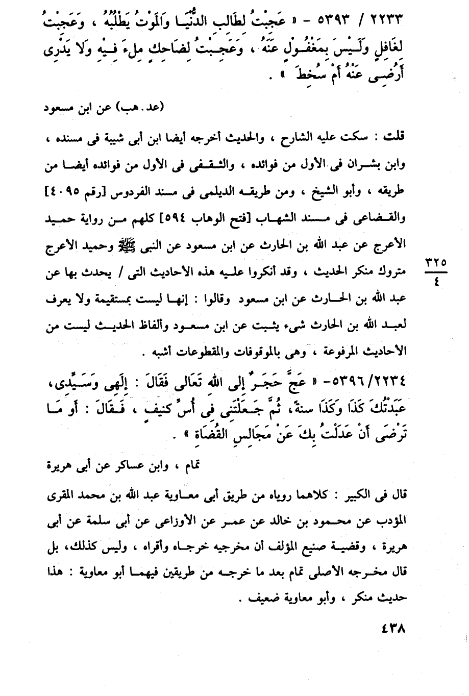 2233/ 5393 - "عَجِبْتُ لِطَالِبِ الدُّنْيَا وَالمَوْتُ يَطْلُبُهُ، وَعَجِبْتُ لغَافِلٍ وَلَيْسَ بِمَغْفُولٍ عَنَهُ، وَعَجبتُ لِضَاحِكٍ مِلءَ فِيهِ وَلا يَدْرِى أَرُضِى عَنْهُ أَمْ سُخِطَ"