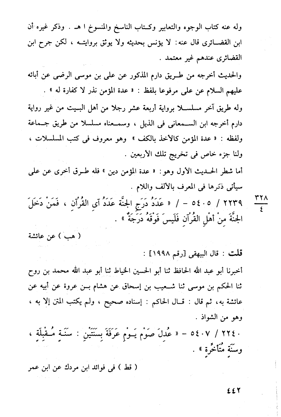 2240/ 5407 - "عُدِلَ صَوْم يَوْمِ عَرَفَةَ بِسَنَتَيْنِ: سَنَة مُقْبِلَةٍ، وسَنَةٍ مُتَأخِّرةٍ".