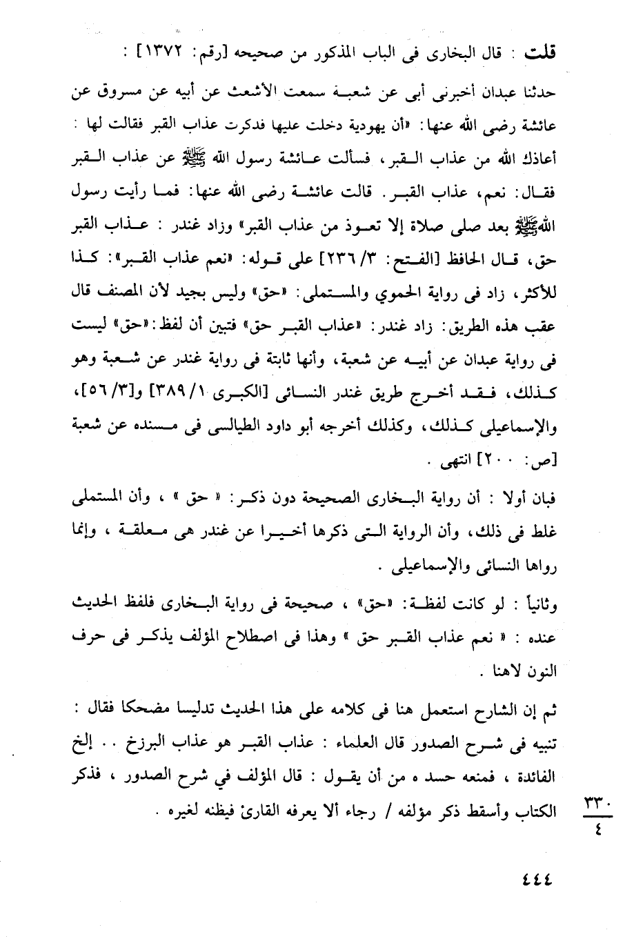 حدثنا عبدان أخبرنى أبي عن شعبه سمعت الأشعث عن أبيه عن مسروق عن عائشة رضي اللَّه عنها: "أن يهودية دخلت عليها فدكرت عذاب القبر فقالت لها: أعاذك اللَّه من عذاب القبر، فسألت عائشة رسول اللَّه -صلى اللَّه عليه وسلم- عن عذاب القبر فقال: نعم، عذاب القبر. قالت عائشة رضي اللَّه عنها: فما رأيت رسول اللَّه -صلى اللَّه عليه وسلم- بعد صلى صلاة إلا تعوذ من عذاب القبر وزاد غندر: عذاب القبر حق، قال الحافظ [الفتح: 3/ 236] على قوله: "نعم عذاب القبر": كذا للأكثر، زاد في رواية الحموي والمستملى: "حق" وليس بجيد لأن المصنف قال عقب هذه الطريق: زاد غندر: "عذاب القبر حق" فتبين أن لفظ: "حق" ليست في رواية عبدان عن أبيه عن شعبة، وأنها ثابتة في رواية غندر عن شعبة وهو كذلك، فقد أخرج طريق غندر النسائى [الكبرى 1/ 389] و [3/ 56]، والإسماعيلى كذلك، وكذلك أخرجه أبو داود الطيالسى في مسنده عن شعبة [ص: 200] انتهى.