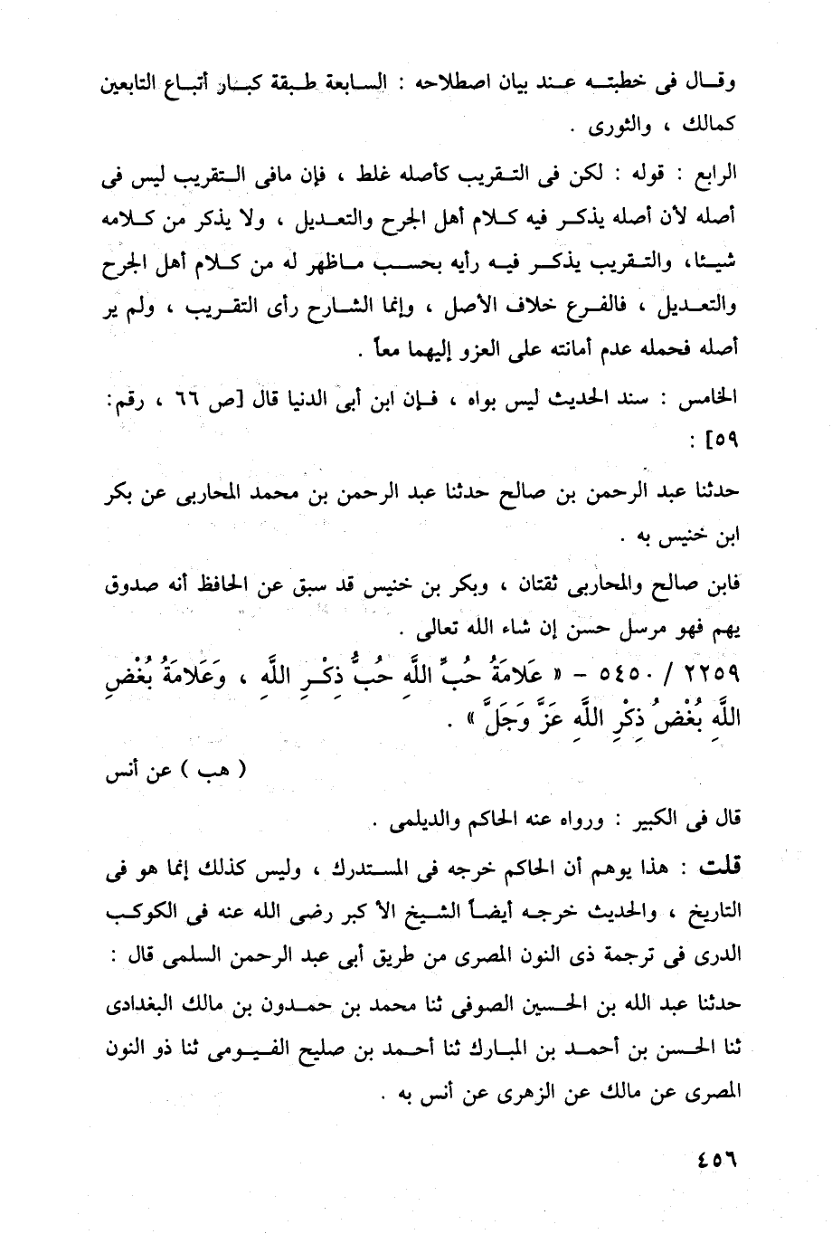 قلت: هذا يوهم أن الحاكم خرجه في المستدرك، وليس كذلك إنما هو في التاريخ، والحديث خرجه أيضًا الشيخ الأكبر رضي اللَّه عنه في الكوكب الدرى في ترجمة ذى النون المصرى من طريق أبي عبد الرحمن السلمى قال: حدثنا عبد اللَّه بن الحسين الصوفى ثنا محمد بن حمدون بن مالك البغدادى ثنا الحسن بن أحمد بن المبارك ثنا أحمد بن صليح الفيومى ثنا ذو النون المصرى عن مالك عن الزهرى عن أنس به.