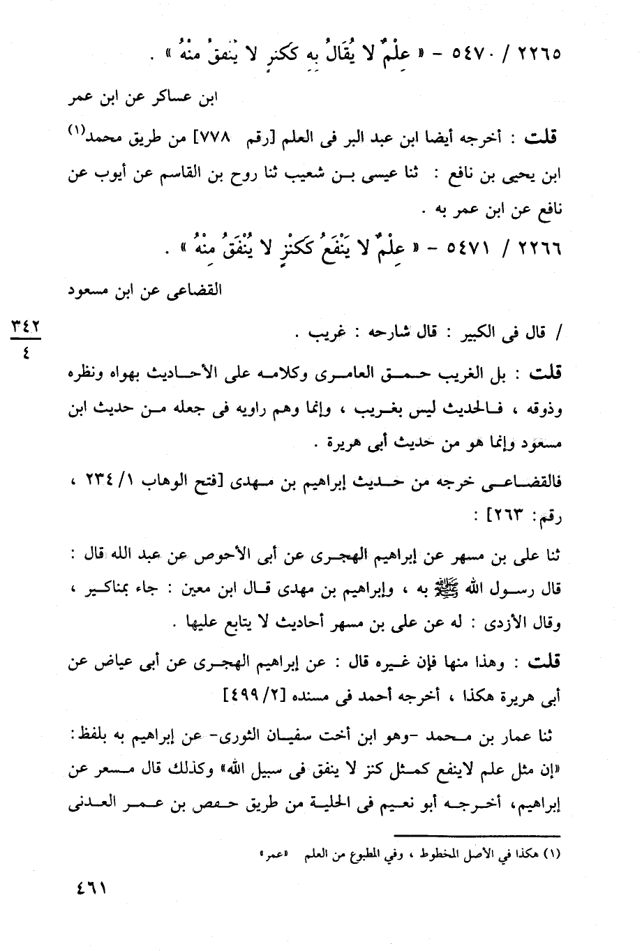ثنا عمار بن محمد -وهو ابن أخت سفيان الثورى- عن إبراهيم به بلفظ: "إن مثل علم لا ينفع كمثل كنز لا ينفق في شيل اللَّه" وكذلك قال مسعر عن إبراهيم، أخرجه أبو نعيم في الحلية من طريق حمص بن عمر العدنى