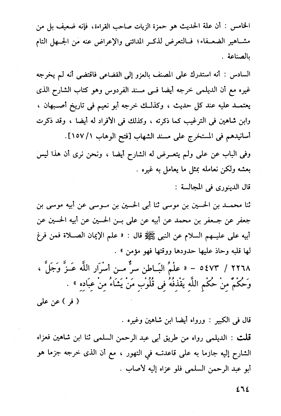 الخامس: أن علة الحديث هو حمزة الزيات صاحب القراءة، فإنه ضعيف بل من مشاهير الضعفاء؛ فالتعرض لذكر المدائنى والإعراض عنه من الجهل التام بالصناعة.