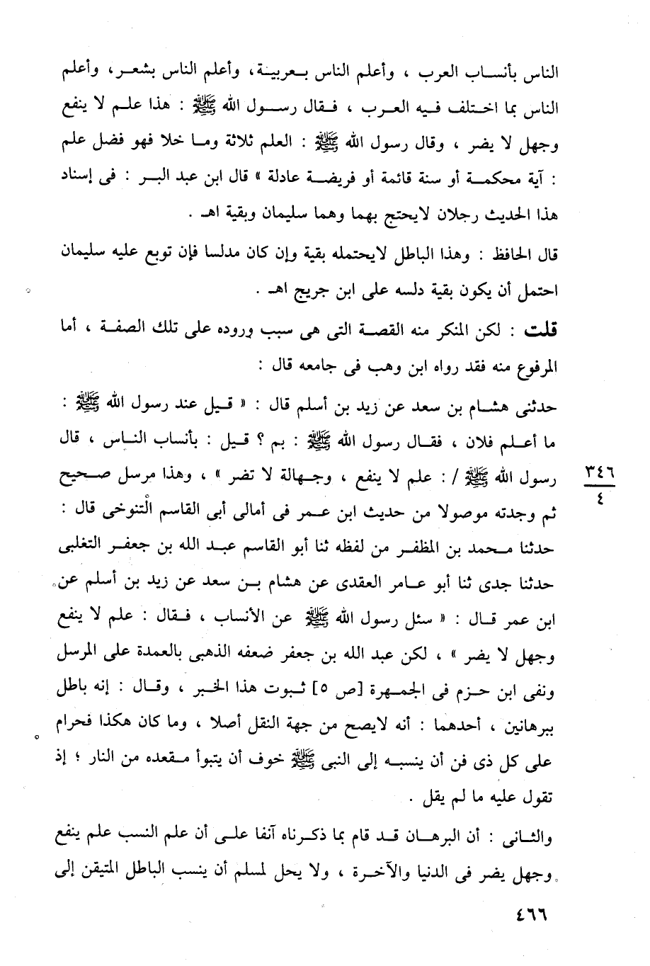 حدثنى هشام بن سعد عن زيد بن أسلم قال: "قيل عند رسول اللَّه -صلى اللَّه عليه وسلم-: ما أعلم فلان، فقال رسول اللَّه -صلى اللَّه عليه وسلم-: بم؟ قيل: بأنساب الناس، قال رسول اللَّه -صلى اللَّه عليه وسلم-: علم لا ينفع، وجهالة لا تضر"، وهذا مرسل صحيح ثم وجدته موصولا من حديث ابن عمر في أمالى أبي القاسم التنوخى قال: حدثنا محمد بن المظفر من لفظه ثنا أبو القاسم عبد اللَّه بن جعفر التغلبى حدثنا جدى ثنا أبو عامر العقدى عن هشام بن سعد عن زيد بن أسلم عن ابن عمر قال: "سئل رسول اللَّه -صلى اللَّه عليه وسلم- عن الأنساب، فقال: علم لا ينفع وجهل لا يضر"، لكن عبد اللَّه بن جعفر ضعفه الذهبى بالعمدة على المرسل ونفى ابن حزم في الجمهرة [ص 5] ثبوت هذا الخبر، وقال: إنه باطل ببرهانين، أحدهما: أنه لا يصح من جهة النقل أصلا، وما كان هكذا فحرام على كل ذى فن أن ينسبه إلى النبي -صلى اللَّه عليه وسلم- خوف أن يتبوأ مقعده من النار؛ إذ تقول عليه ما لم يقل.
