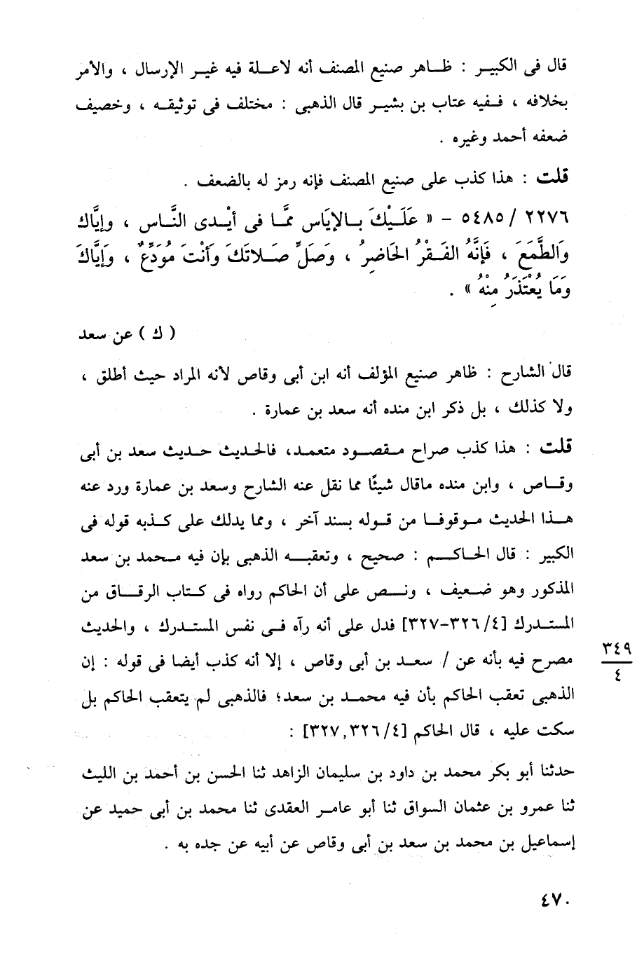 قلت: هذا كذب صراح مقصود متعمد، فالحديث حديث سعد بن أبي وقاص، وابن منده ماقال شيئًا مما نقل عنه الشارح وسعد بن عمارة ورد عنه هذا الحديث موقوفًا من قوله بسند آخر، ومما يدلك على كذبه قوله في الكبير: قال الحاكم: صحيح، وتعقبه الذهبى بإن فيه محمد بن سعد المذكور وهو ضعيف، ونص على أن الحاكم رواه في كتاب الرقاق من المستدرك [4/ 326 - 327] فدل على أنه رآه في نفس المستدرك، والحديث مصرح فيه بأنه عن سعد بن أبي وقاص، إلا أنه كذب أيضًا في قوله: إن الذهبى تعقب الحاكم بأن فيه محمد بن سعد؛ فالذهبى لم يتعقب الحاكم بل سكت عليه، قال الحاكم [4/ 326، 327]: