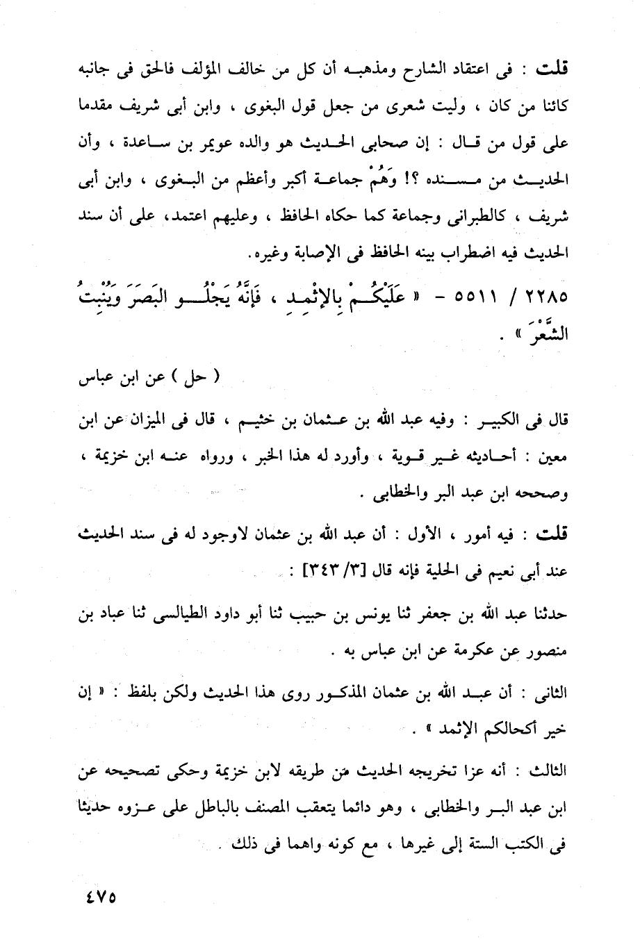 2285/ 5511 - "عَلَيْكُمْ بِالإثْمِدِ، فَإِنَّهُ يَجْلُو البَصَرَ وَيُنْبِتُ الشَّعْرَ".
