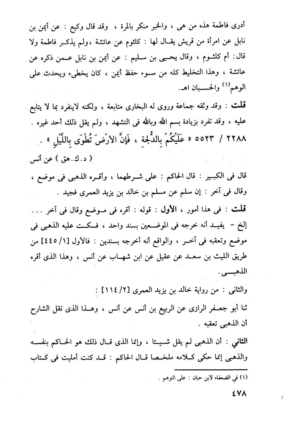 قلت: في هذا أمور، الأول: قوله: أقره في موضع وقال في آخر. . . إلخ -يفيد أنه خرجه في الموضعين بسند واحد، فسكت عليه الذهبى في موضع وتعقبه في آخر، والواقع أنه أخرجه بسندين: فالأول [1/ 445] من طريق الليث بن سعد عن عقيل عن ابن شهاب عن أنس، وهذا الذي أقره الذهبى.