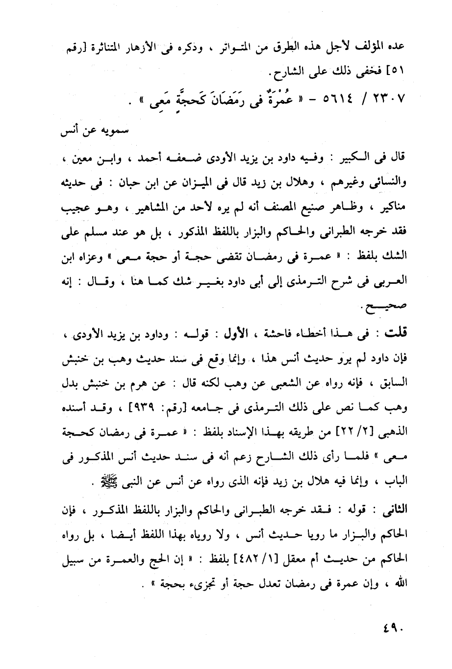 قلت: في هذا أخطاء فاحشة، الأول: قوله: وداود بن يزيد الأودى، فإن داود لم يرو حديث أنس هذا، وإنما وقع في سند حديث وهب بن خنبش السابق، فإنه رواه عن الشعبى عن وهب لكنه قال: عن هرم بن خنبش بدل وهب كما نص على ذلك الترمذى في جامعه [رقم: 939]، وقد أسنده الذهبى [2/ 22] من طريقه بهذا الإسناد بلفظ: "عمرة في رمضان كحجة معى" فلما رأى ذلك الشارح زعم أنه في سند حديث أنس المذكور في الباب، وإنما فيه هلال بن زيد فإنه الذي رواه عن أنس عن النبي -صلى اللَّه عليه وسلم-.