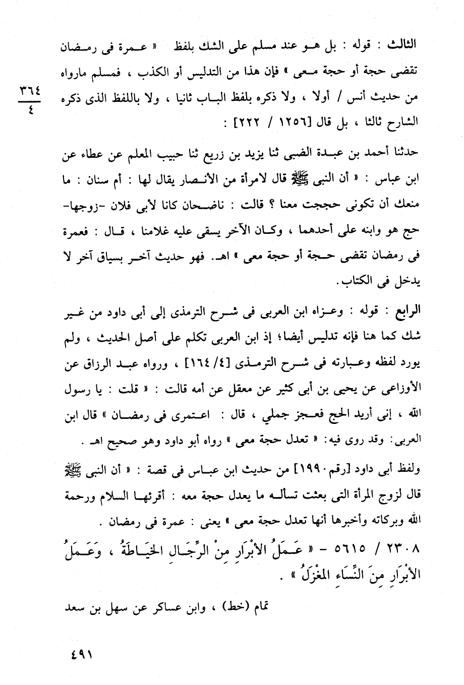 الرابع: قوله: وعزاه ابن العربى في شرح الترمذى إلى أبي داود من غير شك كما هنا فإنه تدليس أيضًا؛ إذ ابن العربى تكلم على أصل الحديث، ولم يورد لفظه وعبارته في شرح الترمذى [4/ 164]، ورواه عبد الرزاق عن الأوزاعى عن يحيى بن أبي كثير عن معقل عن أمه قالت: "قلت: يا رسول اللَّه، إنى أريد الحج فعجز جملي، قال: اعتمرى في رمضان" قال ابن العربى: وقد روى فيه: "تعدل حجة معى" رواه أبو داود وهو صحيح اهـ.