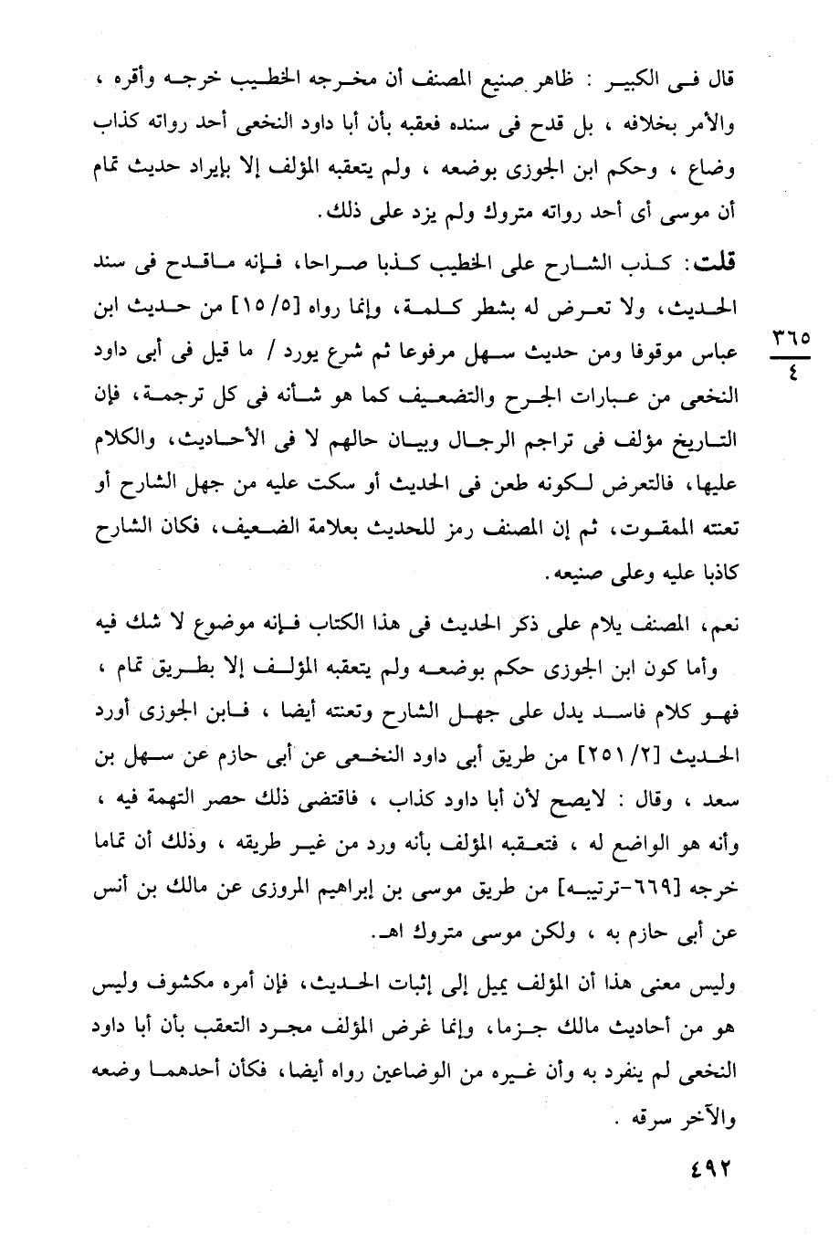قلت: كذب الشارح على الخطيب كذبا صراحا، فإنه ما قدح في سند الحديث، ولا تعرض له بشطر كلمة، وإنما رواه [5/ 15] من حديث ابن عباس موقوفًا ومن حديث سهل مرفوعًا ثم شرع يورد ما قيل في أبي داود النخعى من عبارات الجرح والتضعيف كما هو شأنه في كل ترجمة، فإن التاريخ مؤلف في تراجم الرجال وبيان حالهم لا في الأحاديث، والكلام عليها، فالتعرض لكونه طعن في الحديث أو سكت عليه من جهل الشارح أو تعنته الممقوت، ثم إن المصنف رمز للحديث بعلامة الضعيف، فكان الشارح كاذبا عليه وعلى صنيعه.