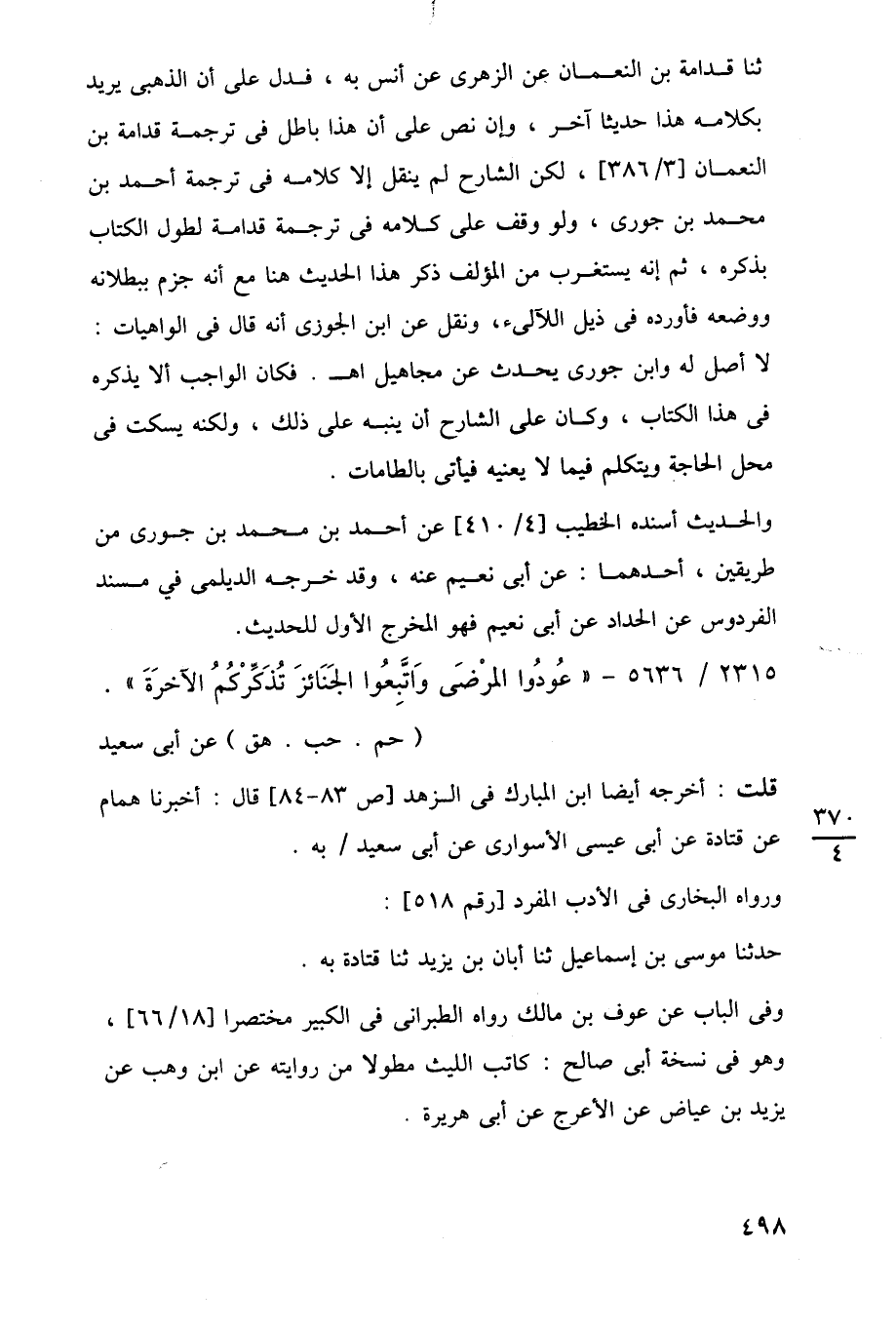 ثنا قدامة بن النعمان عن الزهرى عن أنس به، فدل على أن الذهبى يريد بكلامه هذا حديثا آخر، وإن نص على أن هذا باطل في ترجمة قدامة بن النعمان [3/ 386]، لكن الشارح لم ينقل إلا كلامه في ترجمة أحمد بن محمد بن جورى، ولو وقف على كلامه في ترجمة قدامة لطول الكتاب بذكره، ثم إنه يستغرب من المؤلف ذكر هذا الحديث هنا مع أنه جزم ببطلانه ووضعه فأورده في ذيل اللآلئ، ونقل عن ابن الجوزى أنه قال في الواهيات: لا أصل له وابن جورى يحدث عن مجاهيل اهـ. فكان الواجب ألا يذكره في هذا الكتاب، وكان على الشارح أن ينبه على ذلك، ولكنه يسكت في محل الحاجة ويتكلم فيما لا يعنيه فيأتى بالطامات.