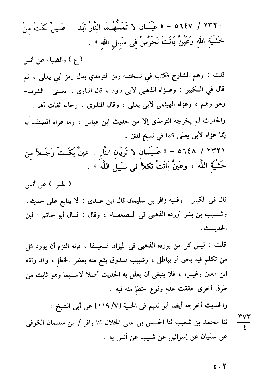 2320/ 5647 - "عَيْنَان لا تَمَسُّهُمَا النَّارُ أبَدا: عَيْنٌ بَكَتْ مِنْ خَشْيَةِ اللَّهِ وَعَيْنٌ بَاتَتْ تَحْرُسُ فِي سَبِيلِ اللَّهِ".