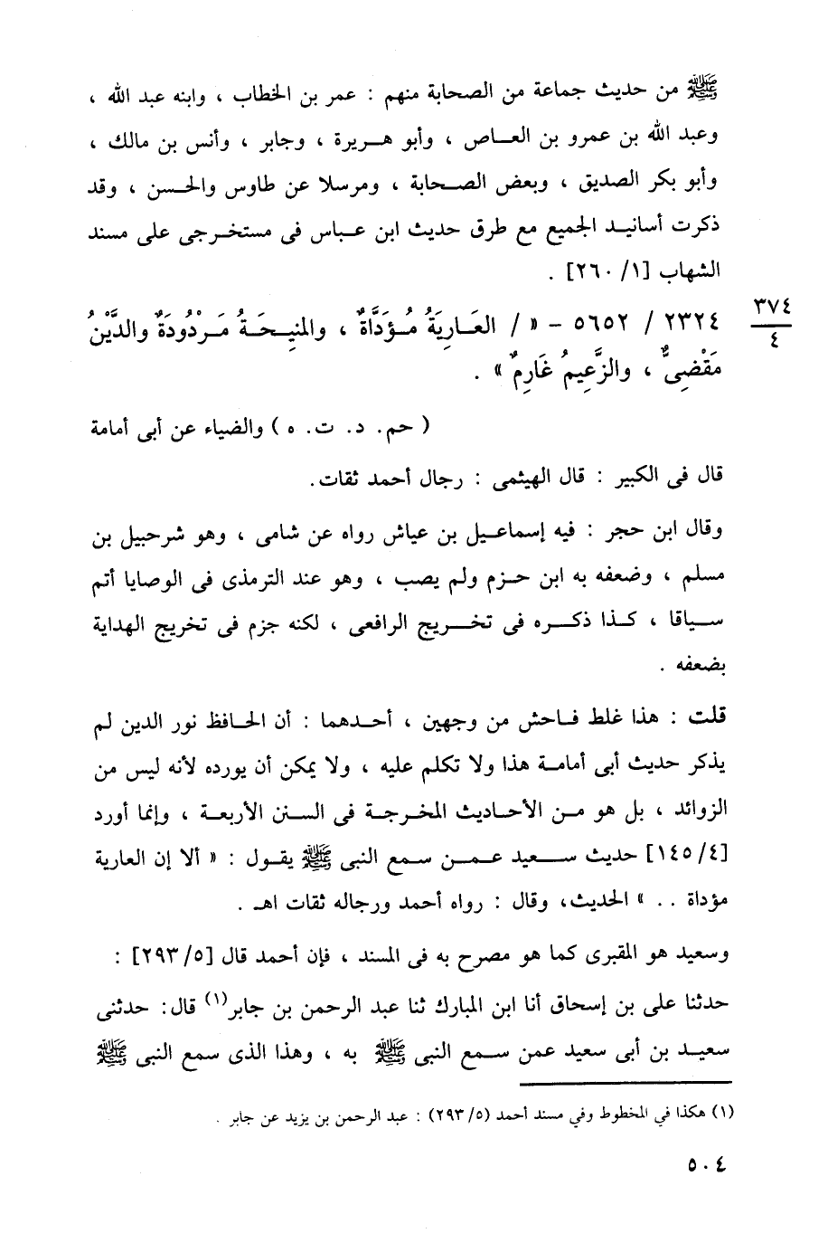 قلت: هذا غلط فاحش من وجهين، أحدهما: أن الحافظ نور الدين لم يذكر حديث أبي أمامة هذا ولا تكلم عليه، ولا يمكن أن يورده لأنه ليس من الزوائد، بل هو من الأحاديث المخرجة في السنن الأربعة، وإنما أورد [4/ 145] حديث سعيد عمن سمع النبي -صلى اللَّه عليه وسلم- يقول: "ألا إن العارية مؤداة. . " الحديث، وقال: رواه أحمد ورجاله ثقات اهـ.