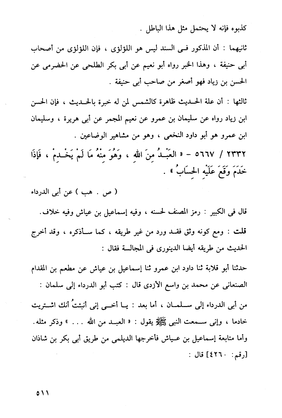 ثالثها: أن علة الحديث ظاهرة كالشمس لمن له خبرة بالحديث، فإن الحسن ابن زياد رواه عن سليمان بن عمرو عن نعيم المجمر عن أبي هريرة، وسليمان ابن عمرو هو أبو داود النخعى، وهو من مشاهير الوضاعين.