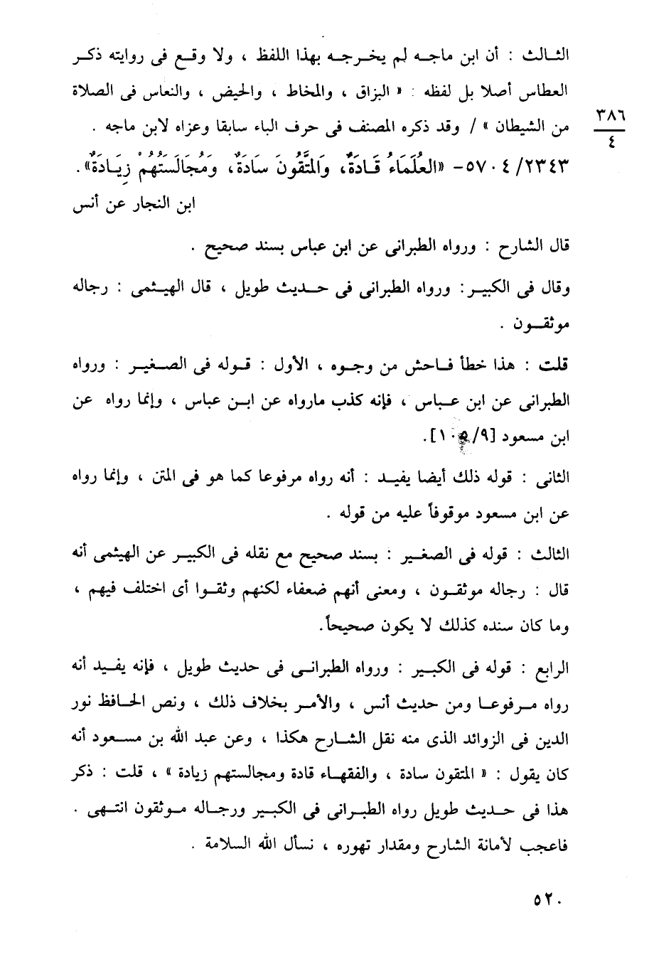 الرابع: قوله في الكبير: ورواه الطبرانى في حديث طويل، فإنه يفيد أنه رواه مرفوعًا ومن حديث أنس، والأمر بخلاف ذلك، ونص الحافظ نور الدين في الزوائد الذي منه نقل الشارح هكذا، وعن عبد اللَّه بن مسعود أنه كان يقول: "المتقون سادة، والفقهاء قادة ومجالستهم زيادة"، قلت: ذكر هذا في حديث طويل رواه الطبرانى في الكبير ورجاله موثقون انتهى.