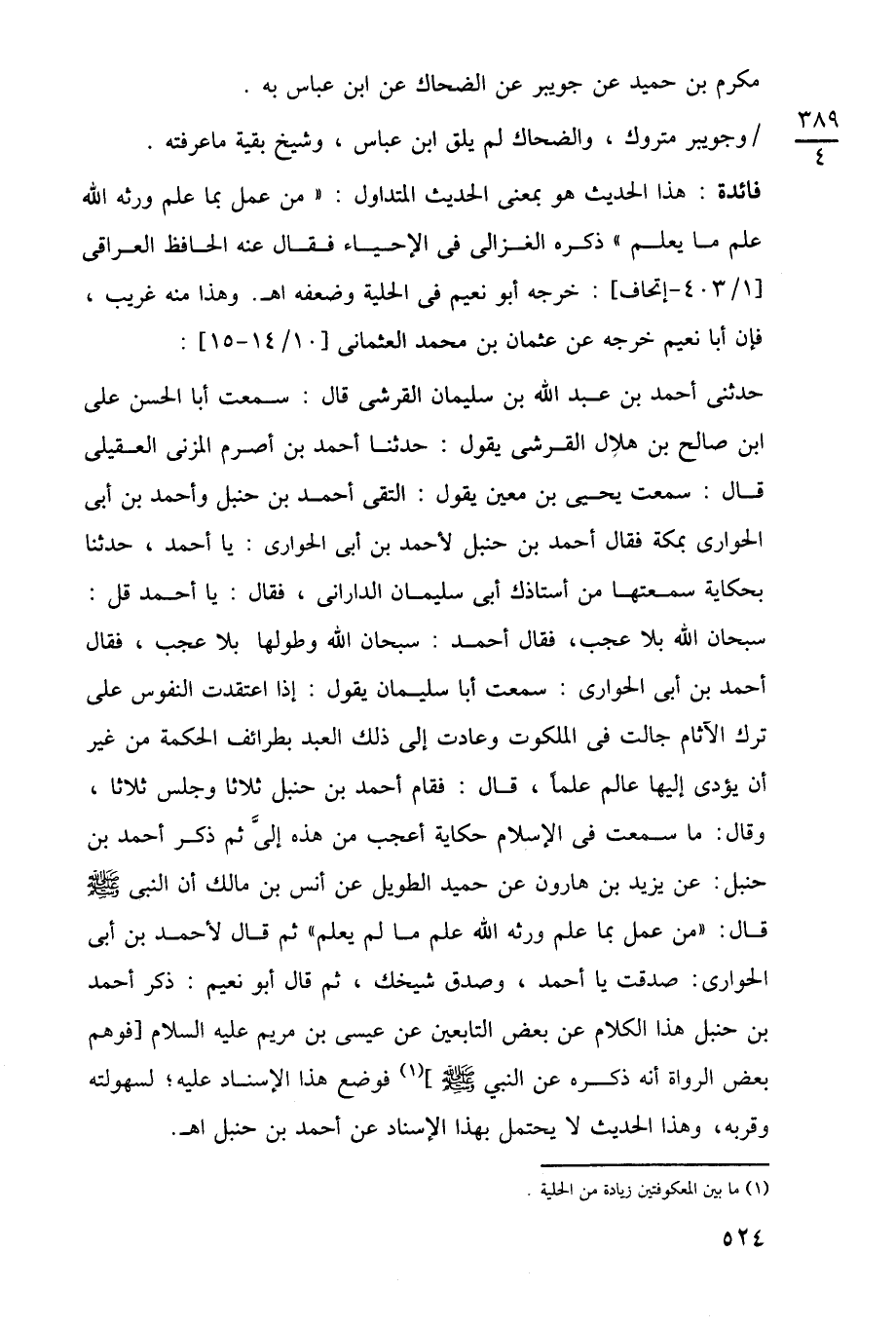 حدثنى أحمد بن عبد اللَّه بن سليمان القرشى قال: سمعت أبا الحسن على ابن صالح بن هلال القرشى يقول: حدثنا أحمد بن أصرم المزنى العقيلى قال: سمعت يحيى بن معين يقول: التقى أحمد بن حنبل وأحمد بن أبي الحوارى بمكة فقال أحمد بن حنبل لأحمد بن أبي الحوارى: يا أحمد، حدثنا بحكاية سمعتها من أستاذك أبي سليمان الدارانى، فقال: يا أحمد قل: سبحان اللَّه بلا عجيب، فقال أحمد: سبحان اللَّه وطولها بلا عجب، فقال أحمد بن أبي الحوارى: سمعت أبا سليمان يقول: إذا اعتقدت النفوس على ترك الآثام جالت في الملكوت وعادت إلى ذلك العبد بطرائف الحكمة من غير أن يؤدى إليها عالم علمًا، قال: فقام أحمد بن حنبل ثلاثا وجلس ثلاثًا، وقال: ما سمعت في الإِسلام حكاية أعجب من هذه إليَّ ثم ذكر أحمد بن حنبل: عن يزيد بن هارون عن حميد الطويل عن أنس بن مالك أن النبي -صلى اللَّه عليه وسلم- قال: "من عمل بما علم ورثه اللَّه علم ما لم يعلم" ثم قال لأحمد بن أبي الحوارى: صدقت يا أحمد، وصدق شيخك، ثم قال أبو نعيم: ذكر أحمد بن حنبل هذا الكلام عن بعض التابعين عن عيسى بن مريم عليه السلام [فوهم بعض الرواة أنه ذكره عن النبي -صلى اللَّه عليه وسلم-] (¬1) فوضع هذا الإسناد عليه؛ لسهولته وقربه، وهذا الحديث لا يحتمل بهذا الإسناد عن أحمد بن حنبل اهـ.
