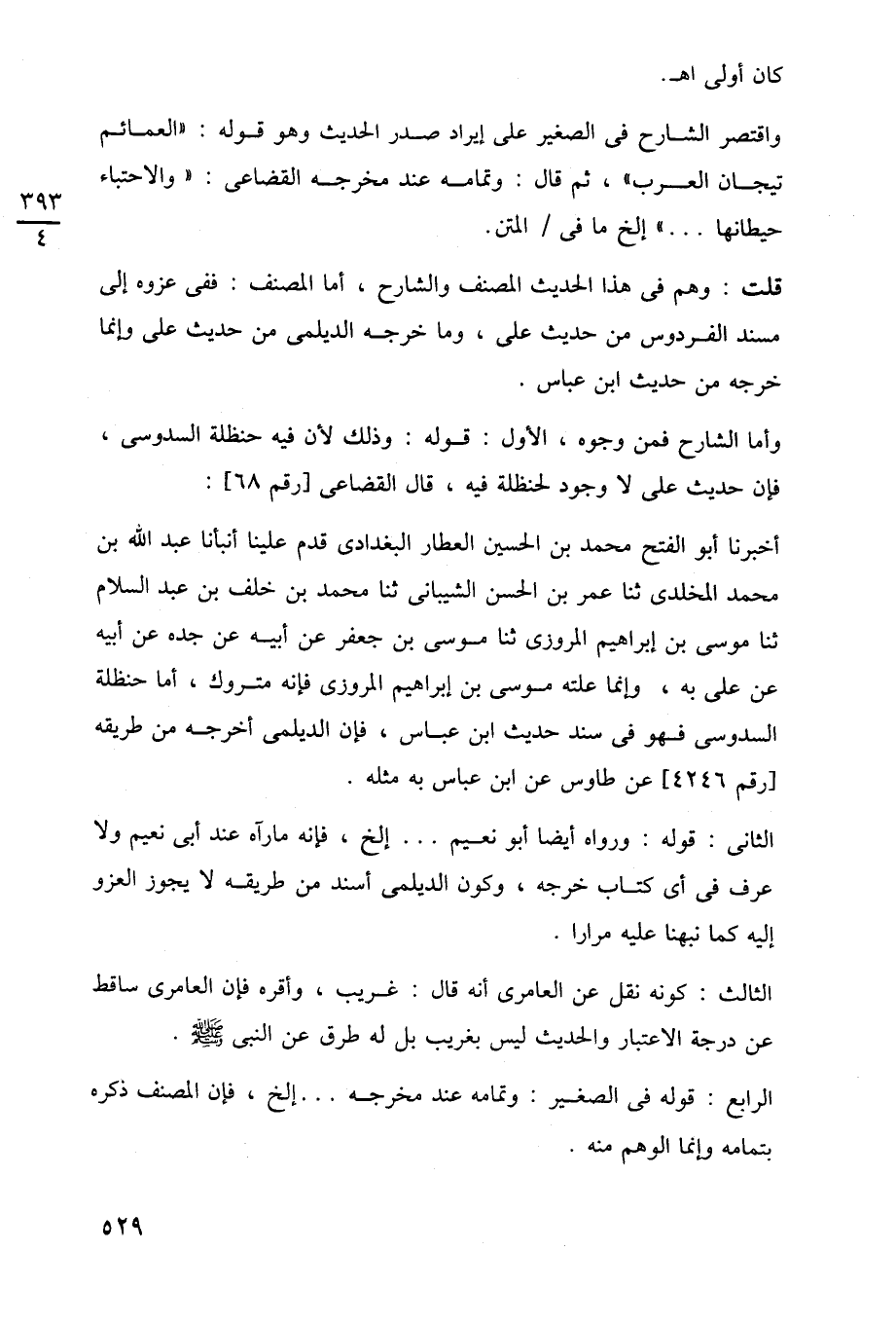 وأما الشارح فمن وجوه، الأول: قوله: وذلك لأن فيه حنظلة السدوسى، فإن حديث على لا وجود لحنظلة فيه، قال القضاعى [رقم 68]: