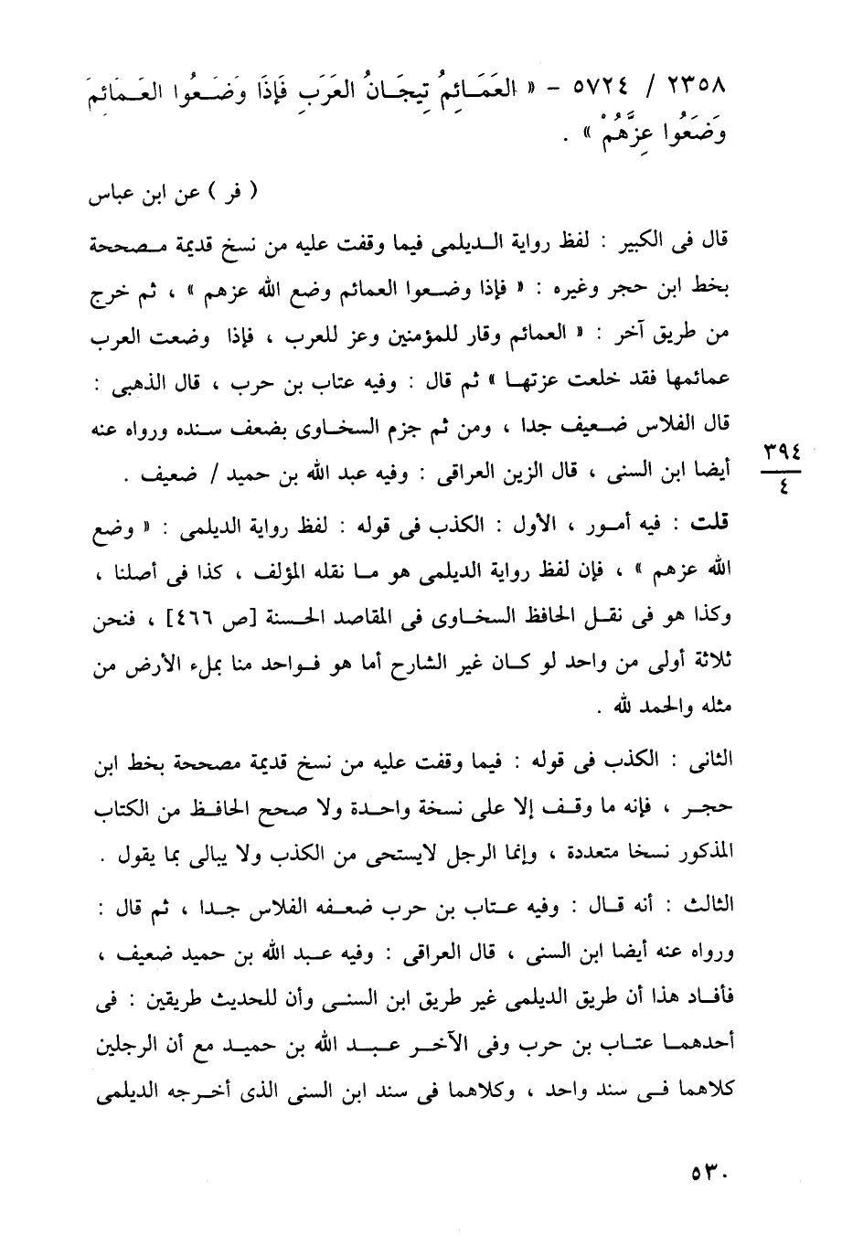 قال في الكبير: لفظ رواية الديلمى فيما وقفت عليه من نسخ قديمة مصححة بخط ابن حجر وغيره: "فإذا وضعوا العمائم وضع اللَّه عزهم", ثم خرج من طريق آخر: "العمائم وقار للمؤمنين وعز للعرب، فإذا وضعت العرب عمائمها فقد خلعت عزتها" ثم قال: وفيه عتاب بن حرب، قال الذهبى: قال الفلاس ضعيف جدًا، ومن ثم جزم السخاوى بضعف سنده ورواه عنه أيضًا ابن السنى، قال الزين العراقى: وفيه عبد اللَّه بن حميد ضعيف.