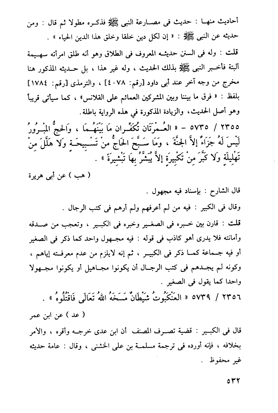 قلت: قارن بين خبره في الصغير وخبره في الكبير، وتعجب من صدقه وأمانته فلا يدرى أهو كاذب في قوله: فيه مجهول واحد كما ذكر في الصغير أو فيه جماعة كما ذكر في الكبير، ثم إنه لا يلزم من عدم معرفته إياهم، وكونه لم يجدهم في كتب الرجال أن يكونوا مجاهيل أو يكونوا مجهولا واحدا كما يقول في الصغير.