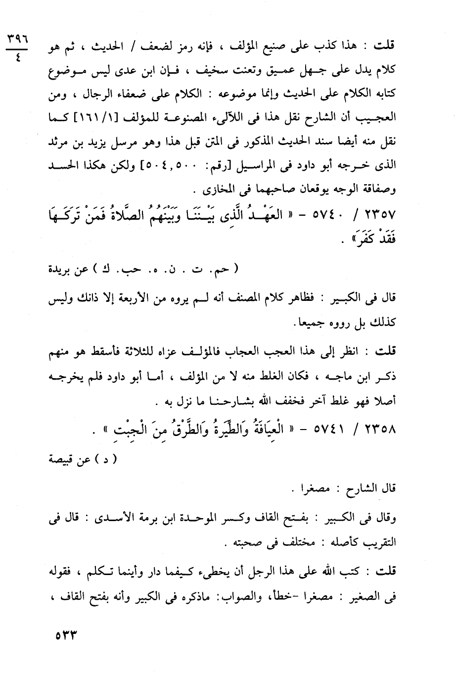 قلت: هذا كذب على صنيع المؤلف، فإنه رمز لضعف الحديث، ثم هو كلام يدل على جهل عميق وتعنت سخيف، فإن ابن عدى ليس موضوع كتابه الكلام على الحديث وإنما موضوعه: الكلام على ضعفاء الرجال، ومن العجيب أن الشارح نقل هذا في اللآلئ المصنوعة للمؤلف [1/ 161] كما نقل منه أيضًا سند الحديث المذكور في المتن قبل هذا وهو مرسل يزيد بن مرثد الذي خرجه أبو داود في المراسيل [رقم: 500, 504] ولكن هكذا الحسد وصفاقة الوجه يوقعان صاحبهما في المخازى.