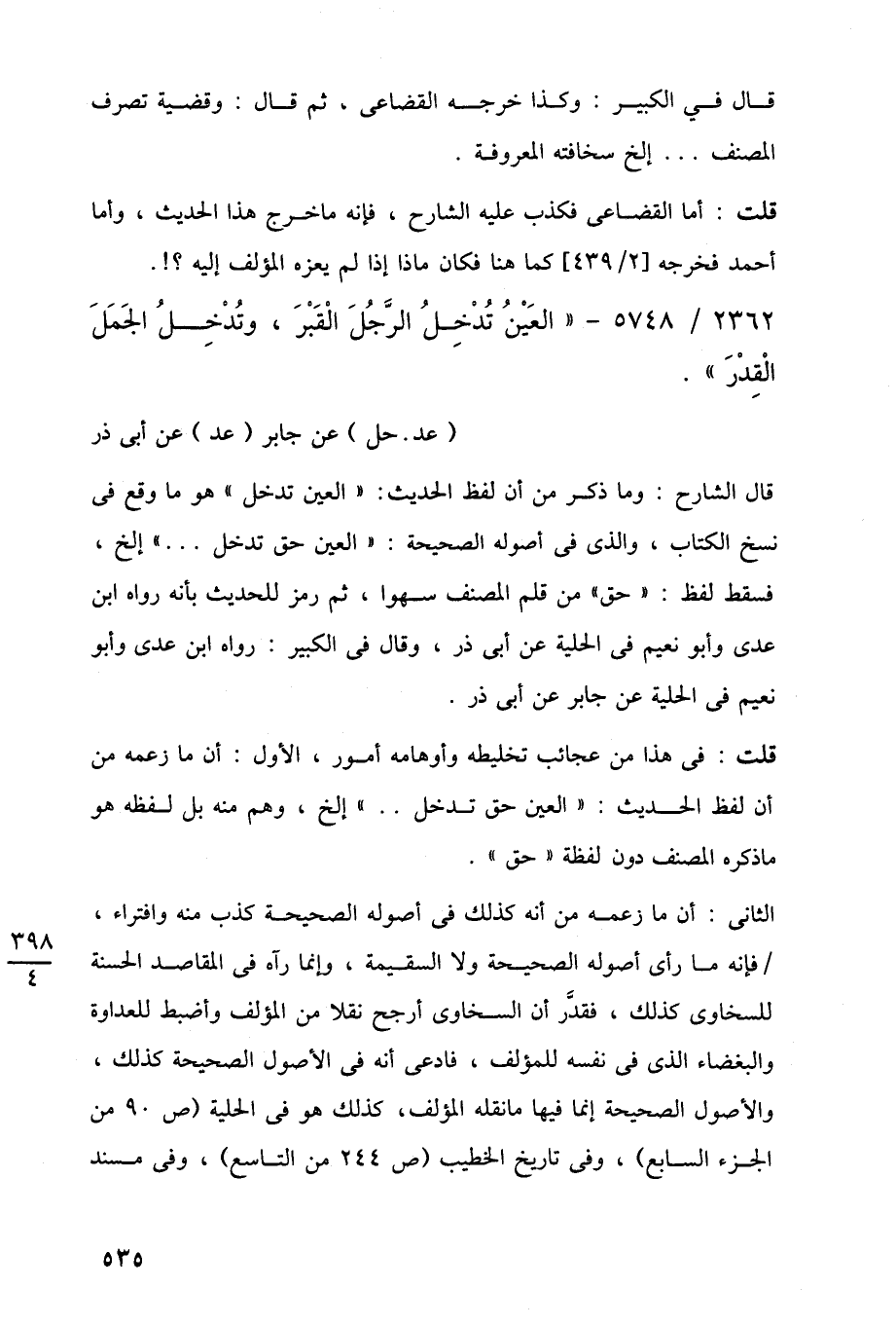 الثانى: أن ما زعمه من أنه كذلك في أصوله الصحيحة كذب منه وافتراء، فإنه ما رأى أصوله الصحيحة ولا السقيمة، وإنما رآه في المقاصد الحسنة للسخاوى كذلك، فقدَّر أن السخاوى أرجح نقلا من المؤلف وأضبط للعداوة والبغضاء الذي في نفسه للمؤلف، فادعى أنه في الأصول الصحيحة كذلك، والأصول الصحيحة إنما فيها ما نقله المؤلف، كذلك هو في الحلية (ص 90 من الجزء السابع)، وفي تاريخ الخطيب (ص 244 من التاسع)، وفي مسند