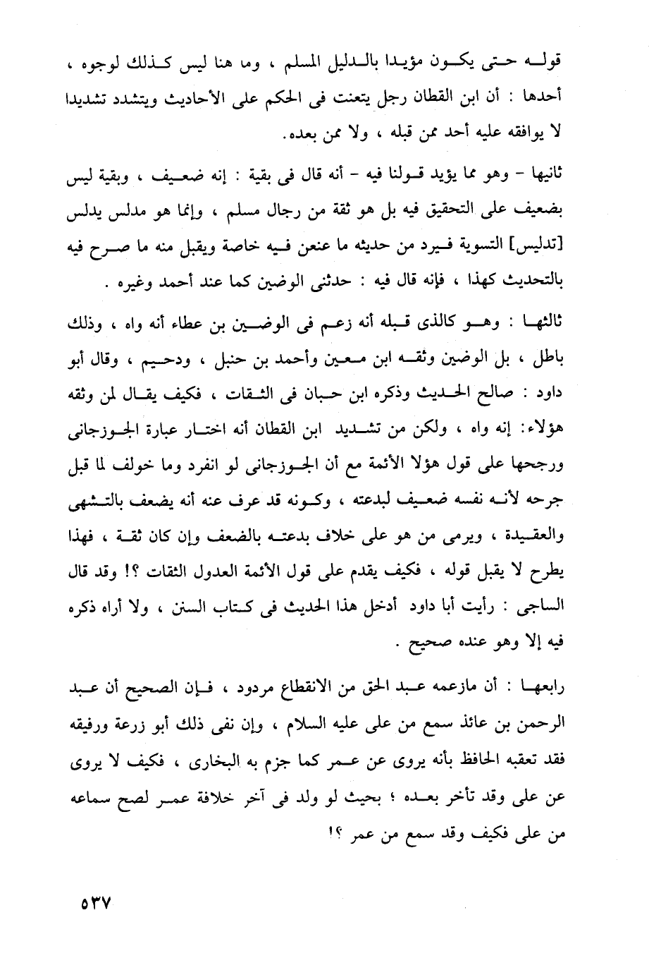 ثالثها: وهو كالذى قبله أنه زعم في الوضين بن عطاء أنه واه، وذلك باطل، بل الوضين وثقه ابن معين وأحمد بن حنبل، ودحيم، وقال أبو داود: صالح الحديث وذكره ابن حبان في الثقات، فكيف يقال لمن وثقه هؤلاء: إنه واه، ولكن من تشديد ابن القطان أنه اختار عبارة الجوزجانى ورجحها على قول هؤلا الأئمة مع أن الجوزجانى لو انفرد وما خولف لما قبل جرحه لأنه نفسه ضعيف لبدعته، وكونه قد عرف عنه أنه يضعف بالتشهى والعقيدة، ويرمى من هو على خلاف بدعته بالضعف وإن كان ثقة، فهذا يطرح لا يقل قوله، فكيف يقدم على قول الأئمة العدول الثقات؟! وقد قال الساجى: رأيت أبا داود أدخل هذا الحديث في كتاب السنن, ولا أراه ذكره فيه إلا وهو عنده صحيح.