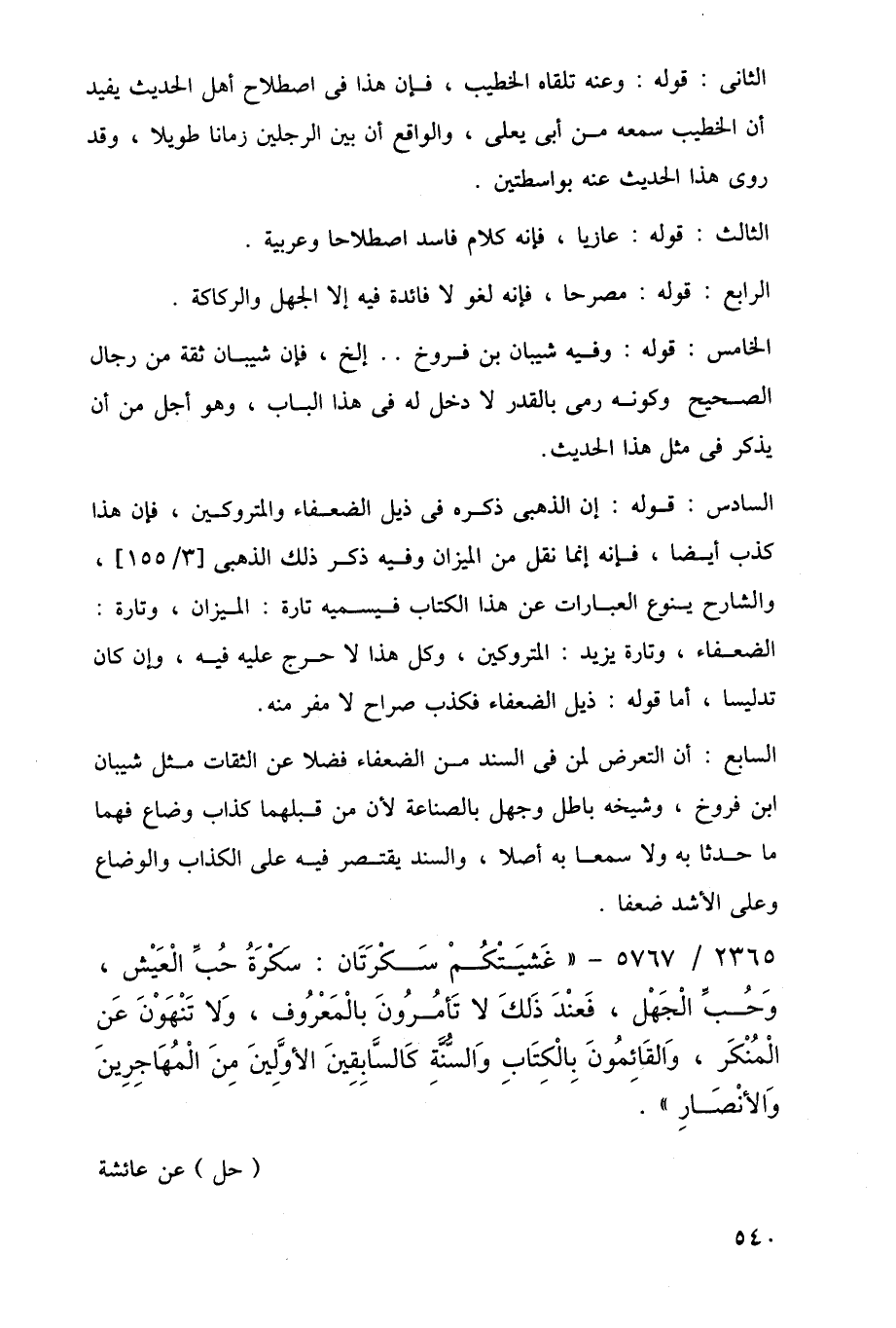 السادس: قوله: إن الذهبى ذكره في ذيل الضعفاء والمتروكين، فإن هذا كذب أيضًا، فإنه إنما نقل من الميزان وفيه ذكر ذلك الذهبى [3/ 155]، والشارح ينوع العبارات عن هذا الكتاب فيسميه تارة: الميزان, وتارة: الضعفاء, وتارة يزيد: المتروكين، وكل هذا لا حرج عليه فيه، وإن كان تدليسا، أما قوله: ذيل الضعفاء فكذب صراح لا مفر منه.