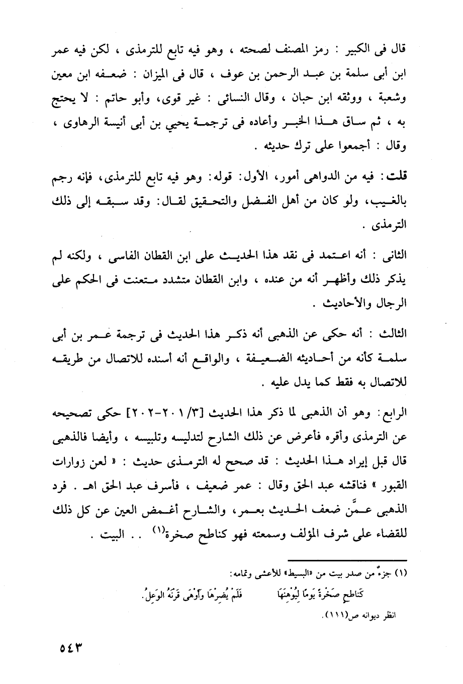 الرابع: وهو أن الذهبى لما ذكر هذا الحديث [3/ 201 - 202] حكى تصحيحه عن الترمذى وأقره فأعرض عن ذلك الشارح لتدليسه وتلبيسه، وأيضًا فالذهبى قال قبل إيراد هذا الحديث: قد صحح له الترمذى حديث: "لعن زوارات القبور" فناقشه عبد الحق وقال: عمر ضعيف، فأسرف عبد الحق اهـ. فرد الذهبى عمَّن ضعف الحديث بعمر، والشارح أغمض العين عن كل ذلك للقضاء على شرف المؤلف وسمعته فهو كناطح صخرة (¬1). . البيت.