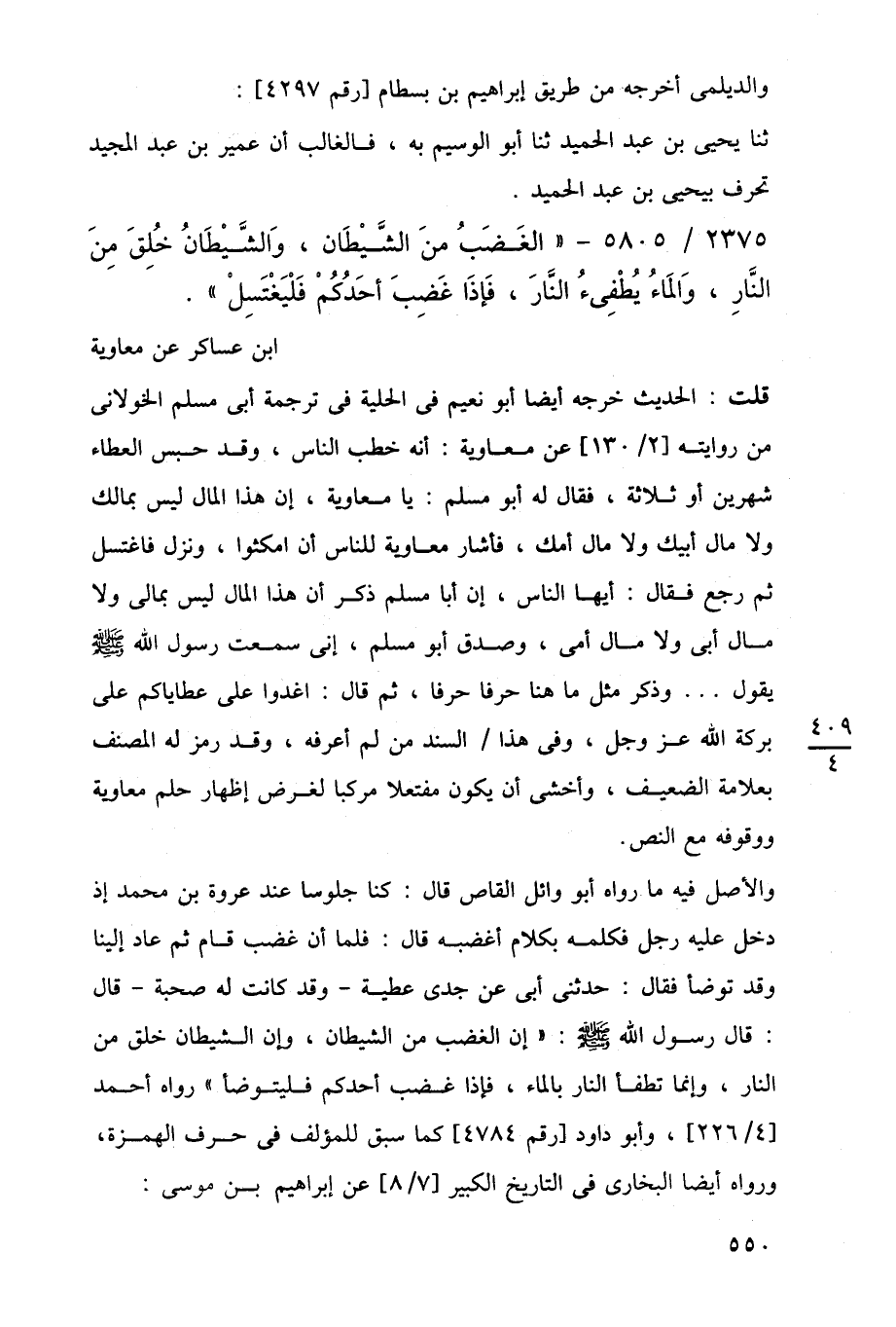2375/ 5805 - "الغَضَبُ منَ الشَّيْطَان، وَالشَّيْطَانُ خُلِقَ مِنَ النَّارِ، وَالمَاءُ يُطْفِئُ النَّارَ، فَإذَا غَضِبَ أحَدُكُمْ فَلْيَغْتَسِلْ".