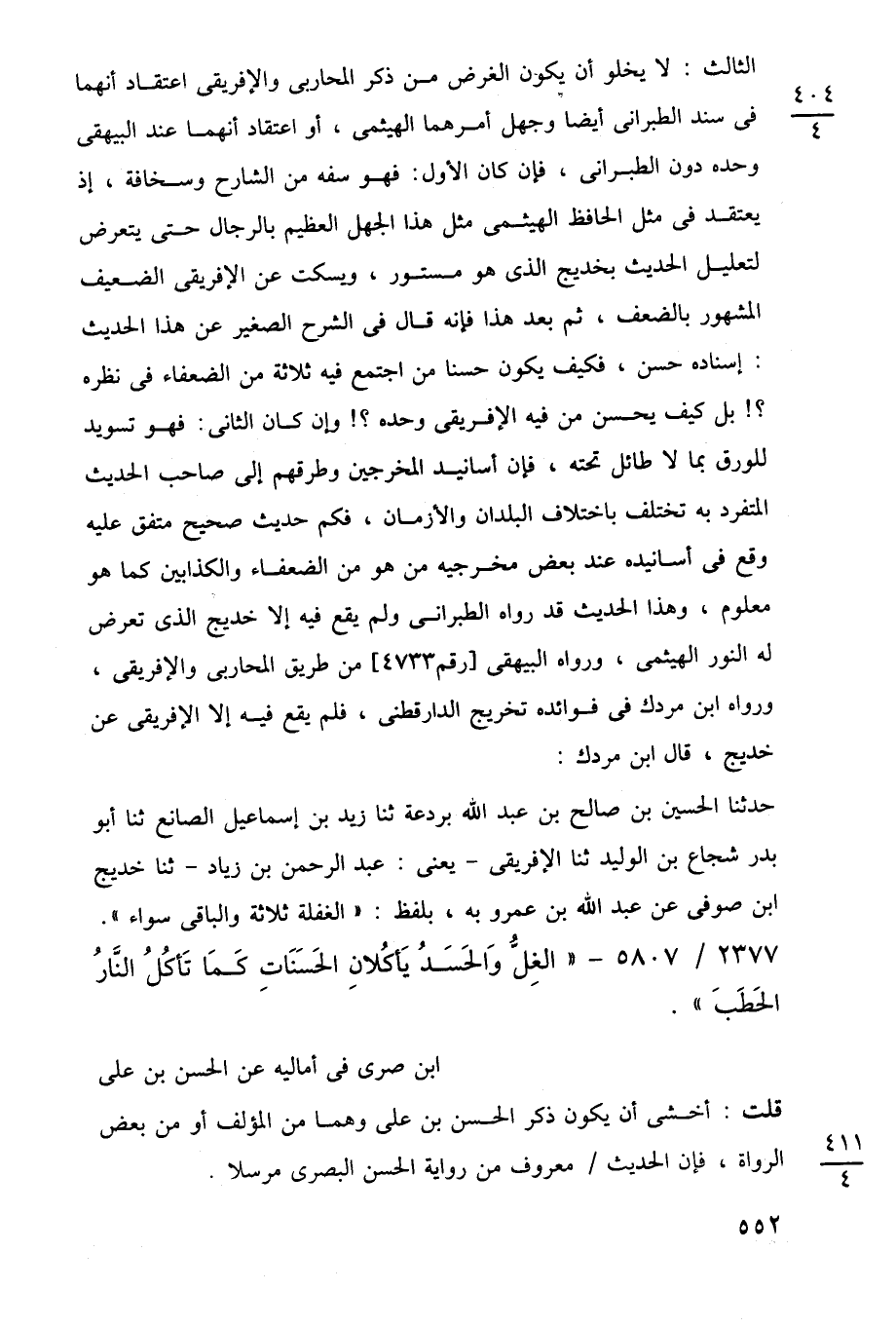 الثالث: لا يخلو أن يكون الغرض من ذكر المحاربى والإفريقى اعتقاد أنهما في سند الطبرانى أيضًا وجهل أمرهما الهيثمى، أو اعتقاد أنهما عند البيهقى وحده دون الطبرانى، فإن كان الأول: فهو سفه من الشارح وسخافة، إذ يعتقد في مثل الحافظ الهيثمى مثل هذا الجهل العظيم بالرجال حتى يتعرض لتعليل الحديث بخديج الذي هو مستور، ويسكت عن الإفريقى الضعيف المشهور بالضعف، ثم بعد هذا فإنه قال في الشرح الصغير عن هذا الحديث: إسناده حسن، فكيف يكون حسنًا من اجتمع فيه ثلاثة من الضعفاء في نظره؟! بل كيف يحسن من فيه الإفريقى وحده؟! وإن كان الثانى: فهو تسويد للورق بما لا طائل تحته، فإن أسانيد المخرجين وطرقهم إلى صاحب الحديث المتفرد به تختلف باختلاف البلدان والأزمان، فكم حديث صحيح متفق عليه وقع في أسانيده عند بعض مخرجيه من هو من الضعفاء والكذابين كما هو معلوم، وهذا الحديث قد رواه الطبرانى ولم يقع فيه إلا خديج الذي تعرض له النور الهيثمى، ورواه البيهقى [رقم 4733] من طريق المحاربى والإفريقى، ورواه ابن مردك في فوائده تخريج الدارقطنى، فلم يقع فيه إلا الإفريقى عن خديج، قال ابن مردك: