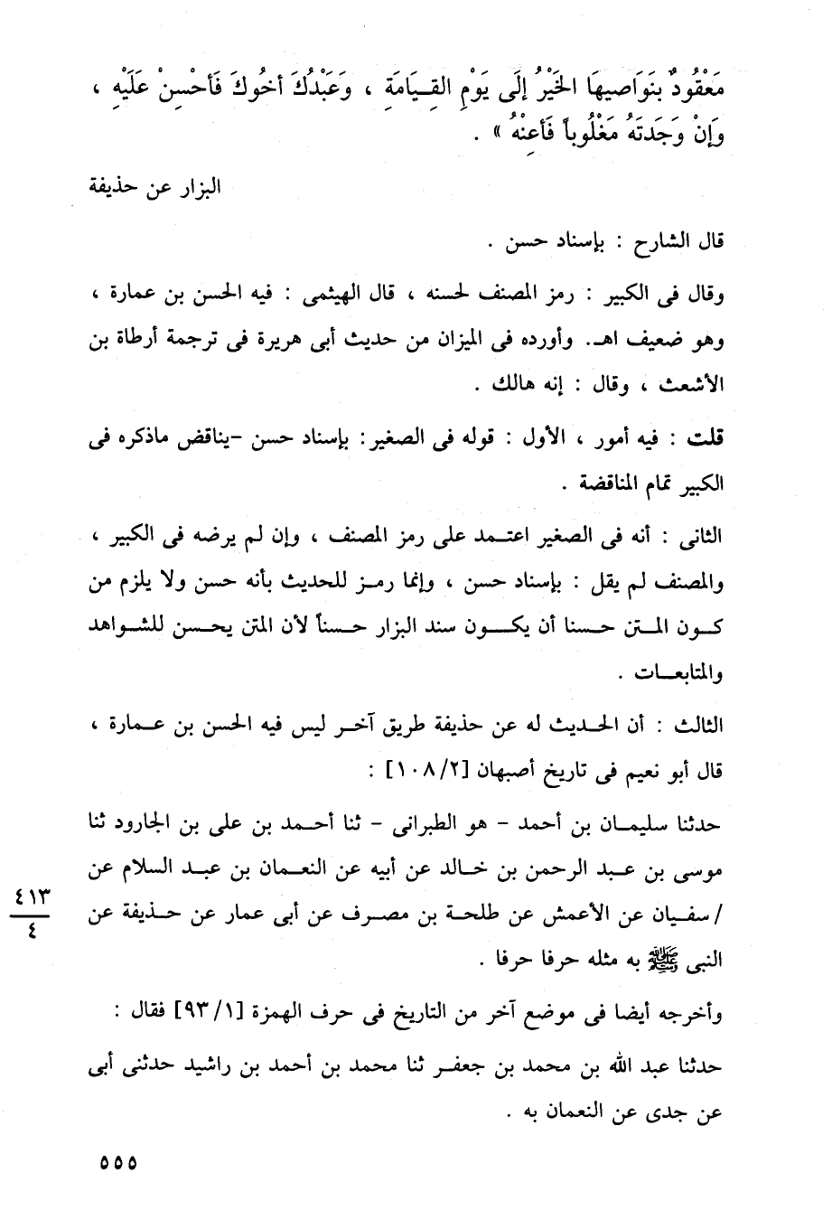 حدثنا سليمان بن أحمد -هو الطبرانى- ثنا أحمد بن على بن الجارود ثنا موسى بن عبد الرحمن بن خالد عن أبيه عن النعمان بن عبد السلام عن سفيان عن الأعمش عن طلحة بن مصرف عن أبي عمار عن حذيفة عن النبي -صلى اللَّه عليه وسلم- به مثله حرفا حرفا.