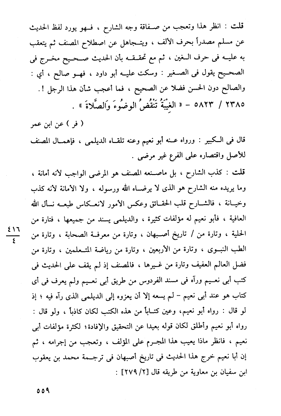 قلت: كذب الشارح، بل ما صنعه المصنف هو المرضى الواجب لأنه أمانة، وما يريده منه الشارح هو الذي لا يرضاه اللَّه ورسوله، ولا الأمانة لأنه كذب وخيانة، فالشارح قلب الحقائق وعكس الأمور لانعكاس طبعه نسأل اللَّه العافية، فأبو نعيم له مؤلفات كثيرة، والديلمى بسند من جميعها، فتارة من الحلية, وتارة من تاريخ أصبهان، وتارة من معرفة الصحابة، وتارة من الطب النبوى، وتارة من الأربعين، وتارة من رياضة المتعلمين، وتارة من فضل العالم العفيف وتارة من غيرها، فالمصنف إذ لم يقف على الحديث في كتب أبي نعيم ورآه في مسند الفردوس من طريق أبي نعيم ولم يعرف في أى كتاب هو عند أبي نعيم -لم يسعه إلا أن يعزوه إلى الديلمى الذي رآه فيه؛ إذ لو قال: رواه أبو نعيم، وعين كتابا من هذه الكتب لكان كاذبًا, ولو قال: رواه أبو نعيم وأطلق لكان قوله بعيدا عن التحقيق والإفادة؛ لكثرة مؤلفات أبي نعيم، فانظر ماذا يعيب هذا المجرم على المؤلف، وتعجب من إجرامه، ثم إن أبا نعيم خرج هذا الحديث في تاريخ أصبهان في ترجمة محمد بن يعقوب ابن سفيان بن معاوية من طريقه قال [2/ 279]: