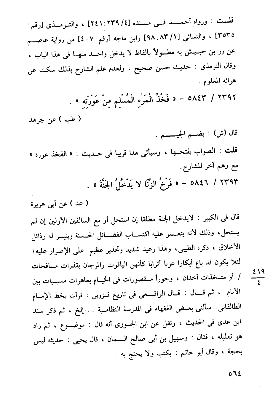 قال في الكبير: لا يدخل الجنة مطلقا إن استحل أو مع السالفين الاولين إن لم يستحل، وذلك لأنه يتعسر عليه اكتساب الفضائل الحسنة ويتيسر له رذائل الأخلاق، ذكره الطيبى، وهذا وعيد شديد وتحذير عظيم على الإصرار عليه؛ لئلا يكون قد باع أبكارا عربا أترابا كأنهن الياقوت والمرجان بقذرات مسافحات أو متخذات أخدان، وحورًا مقصورات في الخيام بعاهرات مسبيات بين الأنام، ثم قال: قال الرافعى في تاريخ قزوين: قرأت بخط الإِمام الطالقانى: سألنى بعض الفقهاء في المدرسة النظامية. . إلخ، ثم ذكر سند ابن عدى في الحديث، ونقل عن ابن الجوزى أنه قال: موضوع، ثم زاد هو تعليله، فقال: وسهيل بن أبي صالح السمان، قال يحيى: حديثه ليس بحجة، وقال أبو حاتم: يكتب ولا يحتج به.
