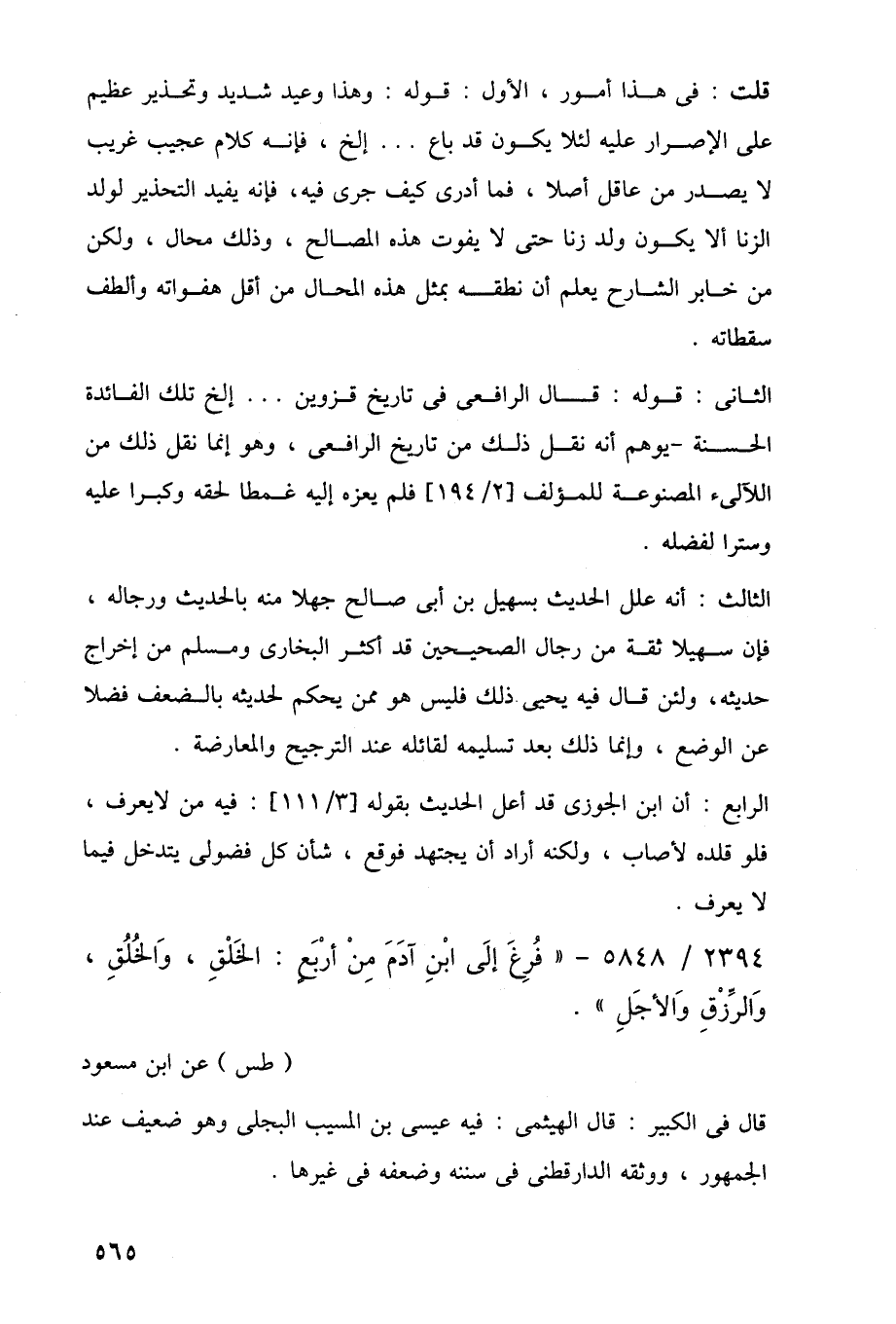 الثالث: أنه علل الحديث بسهيل بن أبي صالح جهلًا منه بالحديث ورجاله، فإن سهيلا ثقة من رجال الصحيحين قد أكثر البخارى ومسلم من إخراج حديثه، ولئن قال فيه يحيى ذلك فليس هو ممن يحكم لحديثه بالضعف فضلا عن الوضع، وإنما ذلك بعد تسليمه لقائله عند الترجيح والمعارضة.