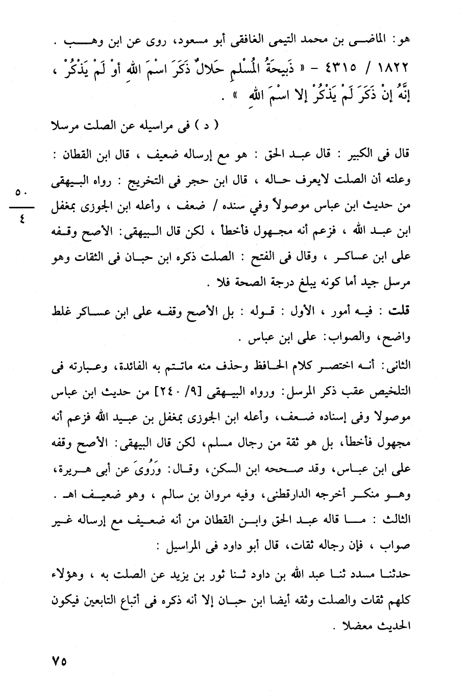 قال في الكبير: قال عبد الحق: هو مع إرساله ضعيف، قال ابن القطان: وعلته أن الصلت لا يعرف حاله، قال ابن حجر في التخريج: رواه البيهقى من حديث ابن عباس موصولًا وفي سنده ضعف، وأعله ابن الجوزى بمغفل ابن عبد اللَّه، فزعم أنه مجهول فأخطأ، لكن قال البيهقى: الأصح وقفه على ابن عساكر، وقال في الفتح: الصلت ذكره ابن حبان في الثقات وهو مرسل جيد أما كونه يبلغ درجة الصحة فلا.