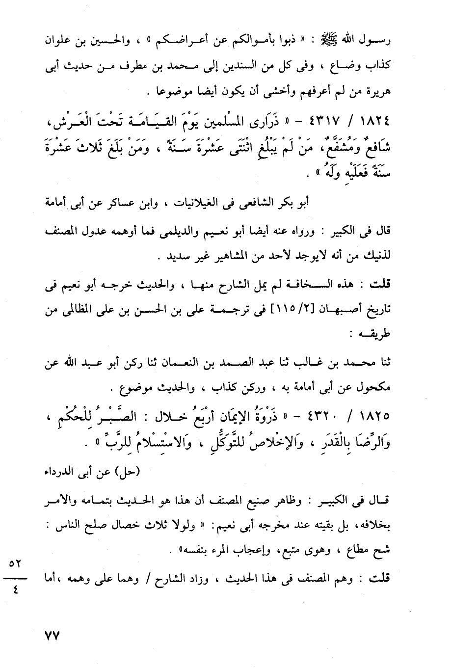 1825/ 4320 - "ذَرْوَةُ الإيمَان أرْبَعُ خلال: الصَّبْرُ لِلْحُكْمِ، وَالرِّضَا بِالْقَدَرِ، وَالإخْلاصُ للتَّوَكُّلِ، وَالاسْتِسْلامُ لِلرَّبِّ".