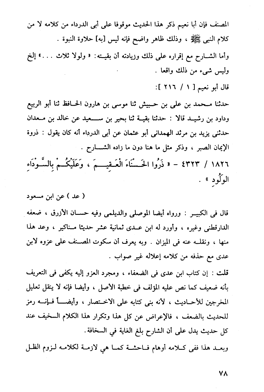 المصنف فإن أبا نعيم ذكر هذا الحديث موقوفًا على أبي الدرداء من كلامه لا من كلام النبي -صلى اللَّه عليه وسلم-، وذلك ظاهر واضح فإنه ليس [به] حلاوة النبوة.