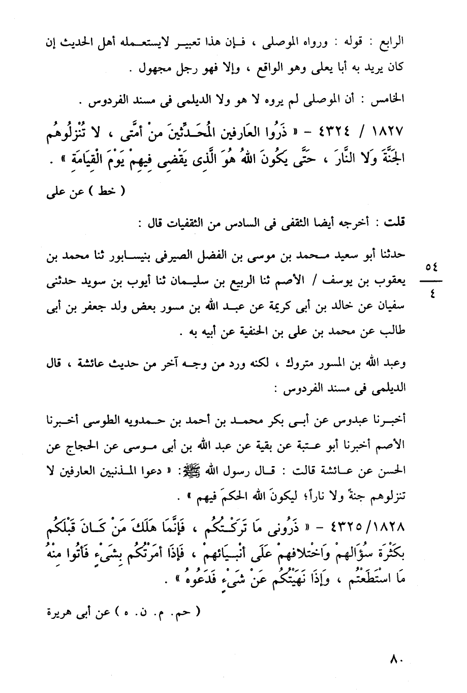 1827/ 4324 - "ذَرُوا العَارفين المُحَدِّثينَ منْ أمَّتى، لا تُنْزلُوهُم الجَنَّةَ وَلا النَّارَ، حَتَّى يكونَ اللَّهُ هُوَ الَّذِى يَقْضِى فِيهِمْ يَوْمَ الْقِيَامَةِ".