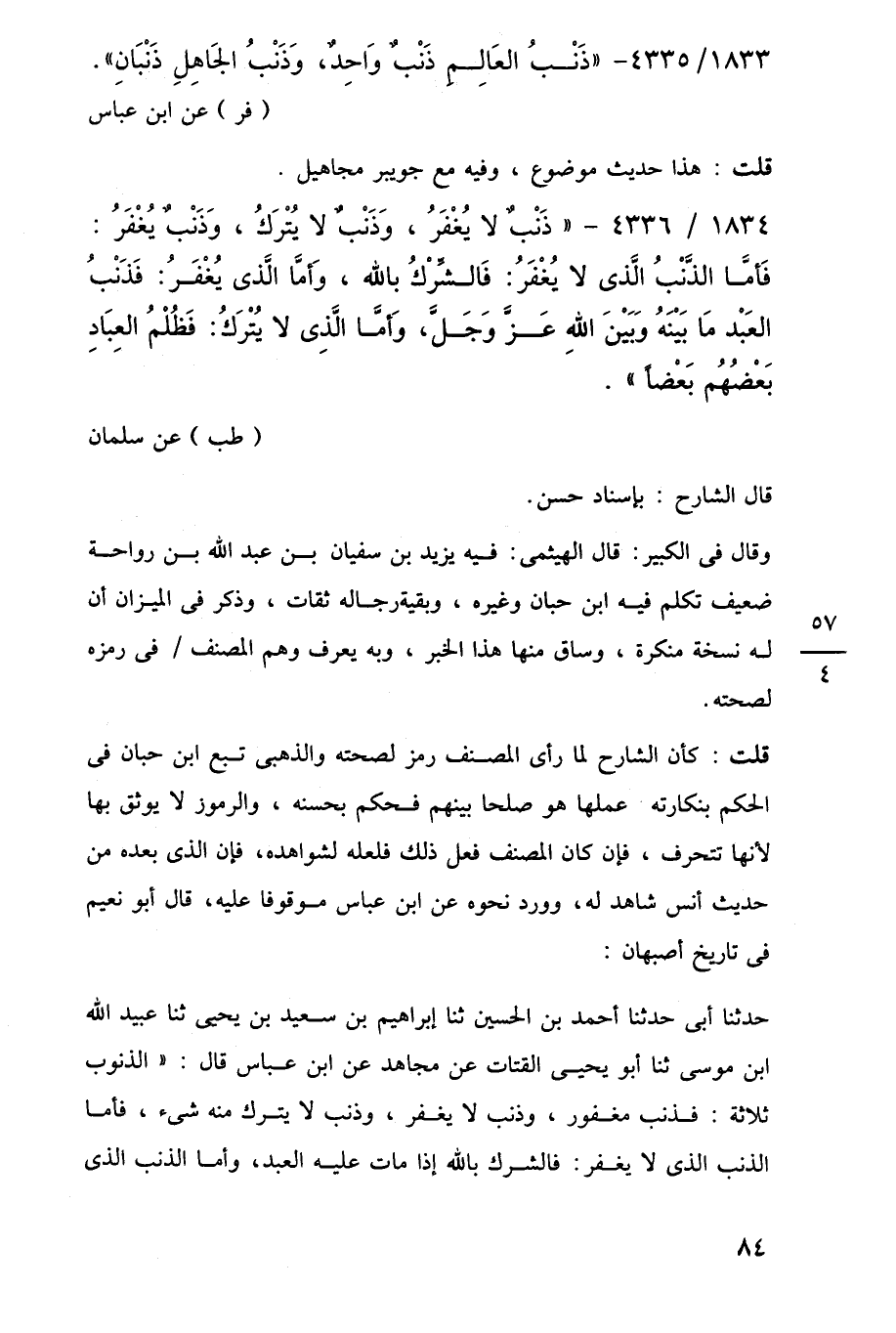 1833/ 4335 - "ذَنْبُ العَالِمِ ذَنْبٌ وَاحِدٌ، وَذَنْبُ الجَاهِلِ ذَنْبَانِ".