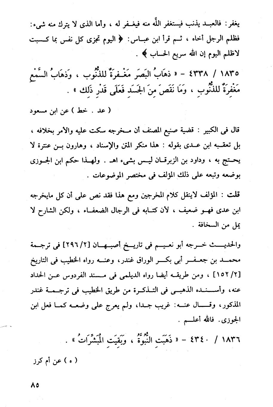 1835/ 4338 - "ذهَابُ البَصَر مَغْفرَةٌ للذُّنُوب، وَذهَابُ السَّمْعِ مَغفِرَةٌ للذُّنُوبِ، وَمَا نَقَصَ مِنَ الجَسَدِ فَعَلَى قَدْرِ ذَلِك".