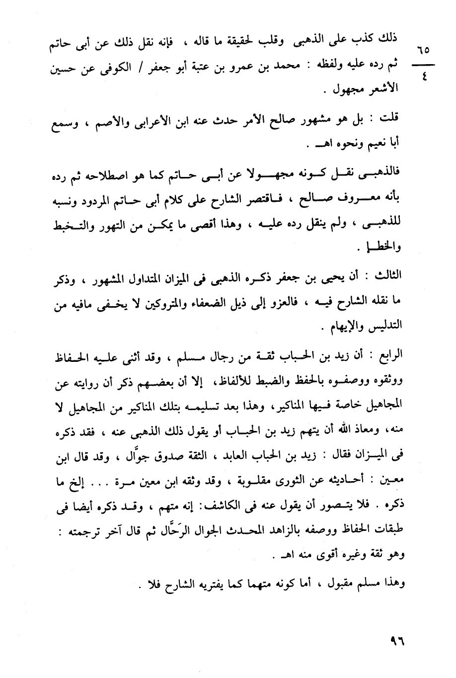 الرابع: أن زيد بن الحباب ثقة من رجال مسلم، وقد أثنى عليه الحفاظ ووثقوه ووصفوه بالحفظ والضبط للألفاظ، إلا أن بعضهم ذكر أن روايته عن المجاهيل خاصة فيها المناكير، وهذا بعد تسليمه بتلك المناكير من المجاهيل لا منه، ومعاذ اللَّه أن يتهم زبد بن الحباب أو يقول ذلك الذهبى عنه، فقد ذكره في الميزان فقال: زيد بن الحباب العابد، الثقة صدوق جوَّال، وقد قال ابن معين: أحاديثه عن الثورى مقلوبة، وقد وثقه ابن معين مرة. . . إلخ ما ذكره. فلا يتصور أن يقول عنه في الكاشف: إنه متهم، وقد ذكره أيضًا في طبقات الحفاظ ووصفه بالزاهد المحدث الجوال الرَحَّال ثم قال آخر ترجمته: وهو ثقة وغيره أقوى منه اهـ.