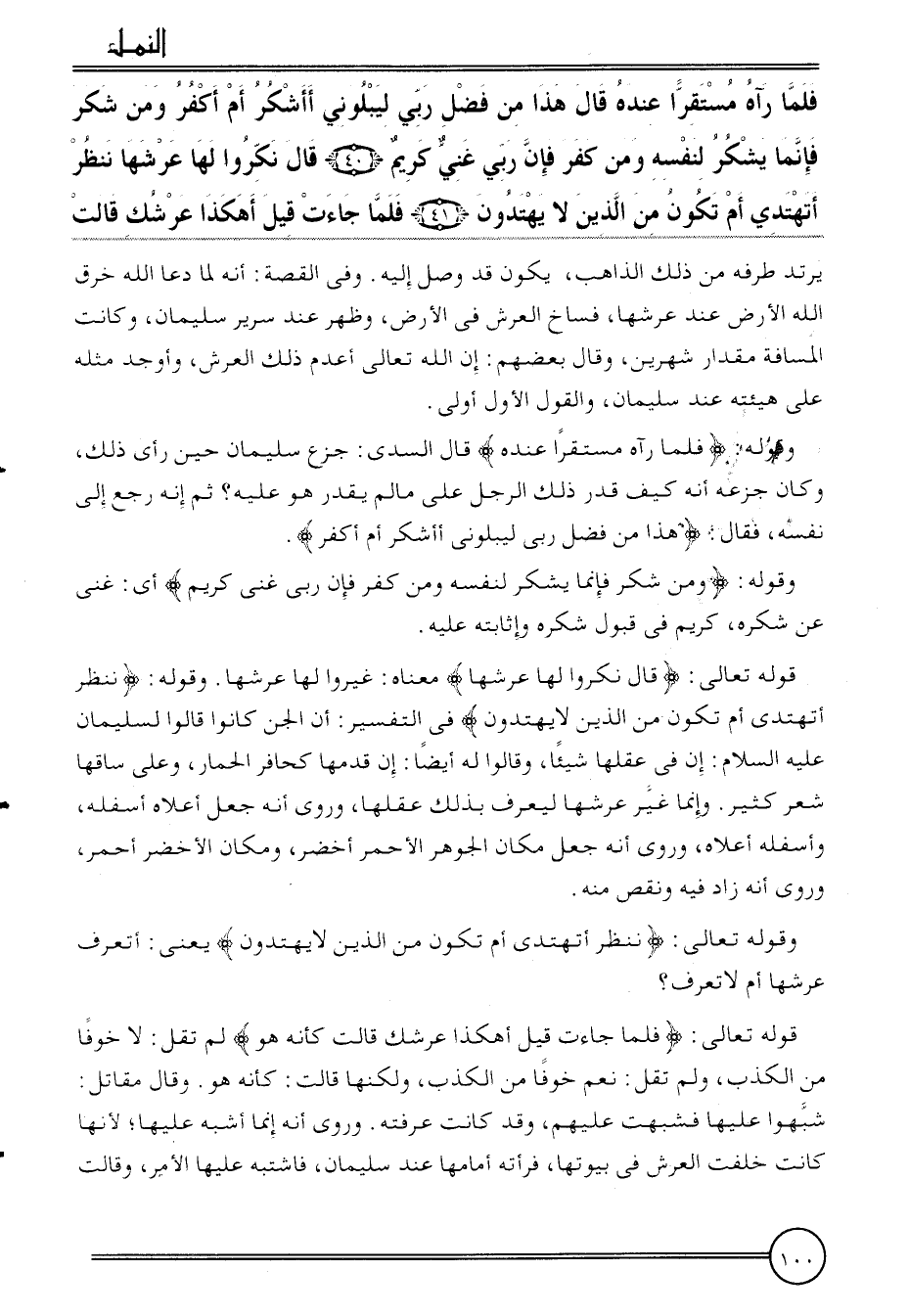 {فَلَمَّا رَآهُ مسقرا عِنْده قَالَ هَذَا من فضل رَبِّي لِيَبْلُوَنِي أَأَشْكُرُ أم أكفر وَمن شكر فَإِنَّمَا يشْكر لنَفسِهِ وَمن كفر فَإِن رَبِّي غَنِي كريم (40) قَالَ نكروا لَهَا عرشها نَنْظُر أتهتدي أم تكون من الَّذين لَا يَهْتَدُونَ (41) فَلَمَّا جَاءَت قيل أهكذا عرشك قَالَت يرْتَد طرفه من ذَلِك الذَّاهِب، يكون قد وصل إِلَيْهِ. وَفِي الْقِصَّة: أَنه لما دَعَا الله خرق الله الأَرْض عِنْد عرشها، فساخ الْعَرْش فِي الأَرْض، وَظهر عِنْد سَرِير سُلَيْمَان، وَكَانَت الْمسَافَة مِقْدَار شَهْرَيْن، وَقَالَ بَعضهم: إِن الله تَعَالَى أعدم ذَلِك الْعَرْش، وأوجد مثله على هَيئته عِنْد سُلَيْمَان، وَالْقَوْل الأول أولى.