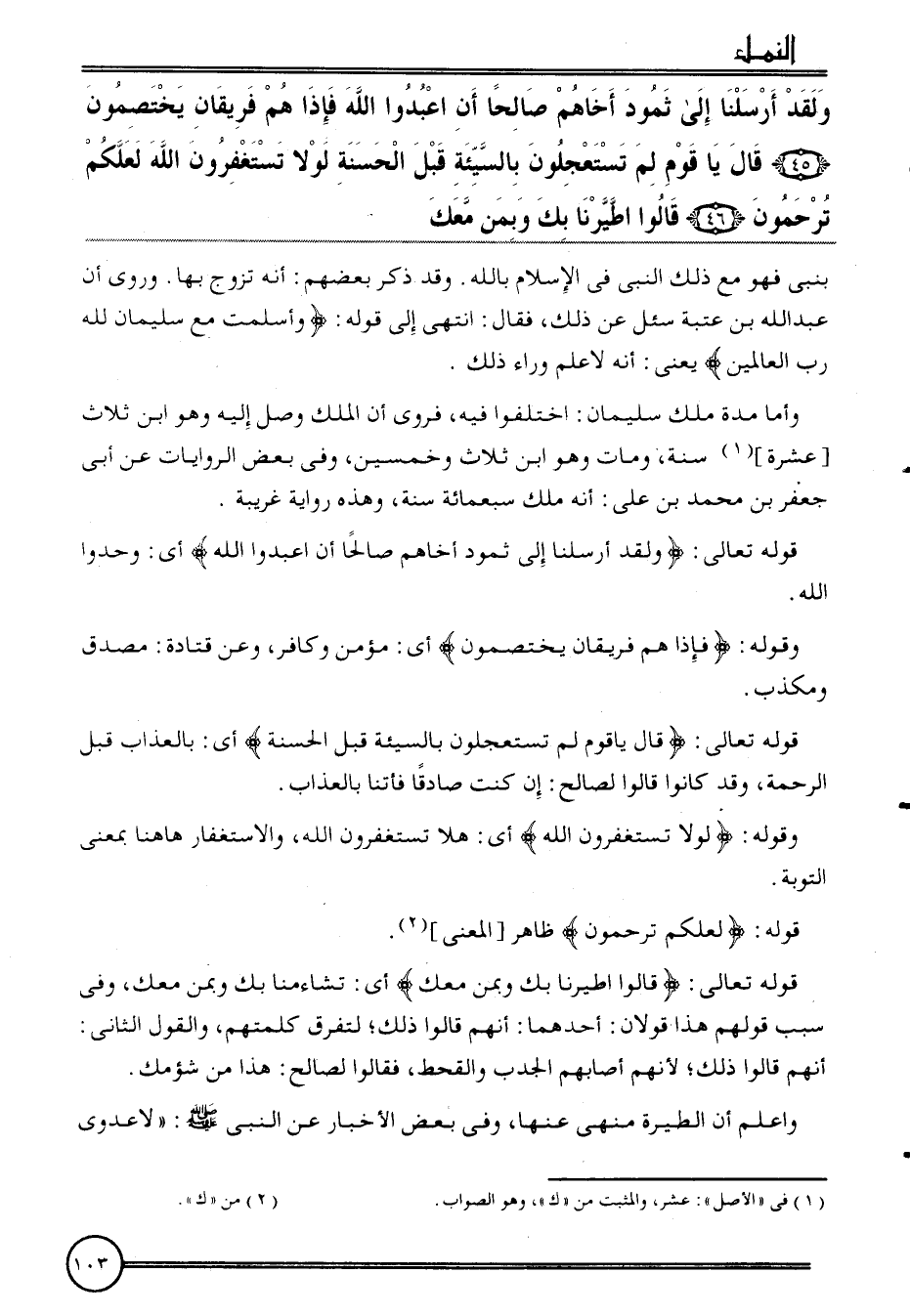 {وَلَقَد أرسلنَا إِلَى ثَمُود أَخَاهُم صَالحا أَن اعبدوا الله فَإِذا هم فريقان يختصمون (45) قَالَ يَا قوم لم تَسْتَعْجِلُون بِالسَّيِّئَةِ قبل الْحَسَنَة لَوْلَا تستغفرون الله لَعَلَّكُمْ ترحمون (46) قَالُوا اطيرنا بك وبمن مَعَك} بِنَبِي فَهُوَ مَعَ ذَلِك النَّبِي فِي الْإِسْلَام بِاللَّه. وَقد ذكر بَعضهم: أَنه تزوج بهَا. وروى أَن عبد الله بن عتبَة سُئِلَ عَن ذَلِك، فَقَالَ: انْتهى إِلَى قَوْله: {وَأسْلمت مَعَ سُلَيْمَان لله رب الْعَالمين} يَعْنِي: أَنه لَا علم وَرَاء ذَلِك.