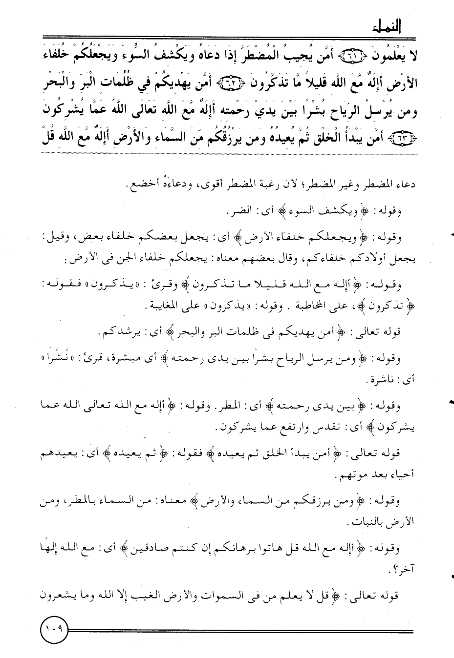{لَا يعلمُونَ (61) أَمن يُجيب الْمُضْطَر إِذا دَعَاهُ ويكشف السوء ويجعلكم خلفاء الأَرْض أإله مَعَ الله قَلِيلا مَا تذكرُونَ (62) أَمن يهديكم فِي ظلمات الْبر وَالْبَحْر وَمن يُرْسل الرِّيَاح بشرا بَين يَدي رَحمته أإله مَعَ الله تَعَالَى الله عَمَّا يشركُونَ (63) أَمن يبْدَأ الْخلق ثمَّ يُعِيدهُ ثمَّ وَمن يرزقكم من السَّمَاء وَالْأَرْض أإله مَعَ الله قل} دُعَاء الْمُضْطَر وَغير الْمُضْطَر؛ لِأَن رَغْبَة الْمُضْطَر أقوى، ودعاؤه أخضع.