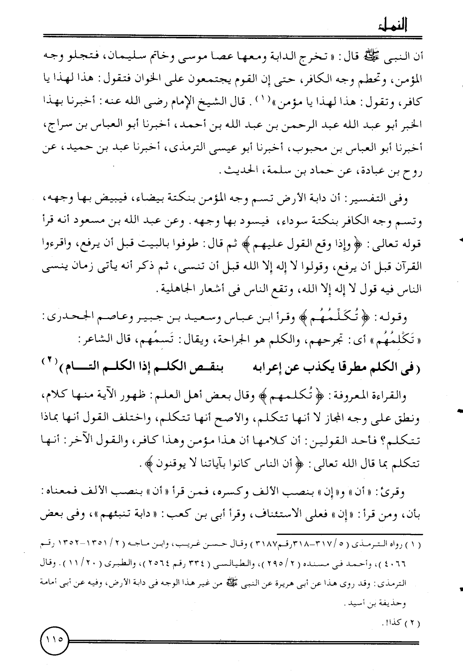 أَن النَّبِي قَالَ: " تخرج الدَّابَّة وَمَعَهَا عَصا مُوسَى وَخَاتم سُلَيْمَان، فتجلو وَجه الْمُؤمن، وتحطم وَجه الْكَافِر، حَتَّى إِن الْقَوْم يَجْتَمعُونَ على الخوان فَتَقول: هَذَا لهَذَا يَا كَافِر، وَتقول: هَذَا لهَذَا يَا مُؤمن ". قَالَ الشَّيْخ الإِمَام رَضِي الله عَنهُ: أخبرنَا بِهَذَا الْخَبَر أَبُو عبد الله عبد الرَّحْمَن بن عبد الله بن أَحْمد، أخبرنَا أَبُو الْعَبَّاس بن سراج، أخبرنَا أَبُو الْعَبَّاس بن مَحْبُوب، أخبرنَا أَبُو عِيسَى التِّرْمِذِيّ، أخبرنَا عبد بن حميد، عَن روح بن عبَادَة، عَن حَمَّاد بن سَلمَة، الحَدِيث.