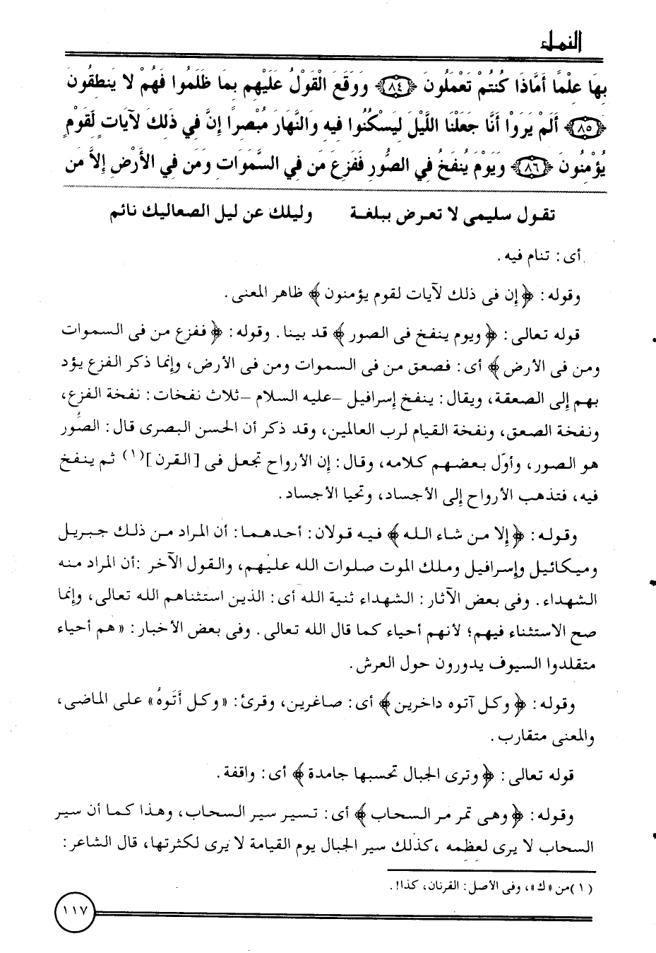 {بهَا علما أماذا كُنْتُم تَعْمَلُونَ (84) وَوَقع القَوْل عَلَيْهِم بِمَا ظلمُوا فهم لَا ينطقون (85) ألم يرَوا أَنا جعلنَا اللَّيْل ليسكنوا فِيهِ وَالنَّهَار مبصرا إِن فِي ذَلِك لآيَات لقوم يُؤمنُونَ (86) وَيَوْم ينْفخ فِي الصُّور فَفَزعَ من فِي السَّمَوَات وَمن فِي الأَرْض إِلَّا من}