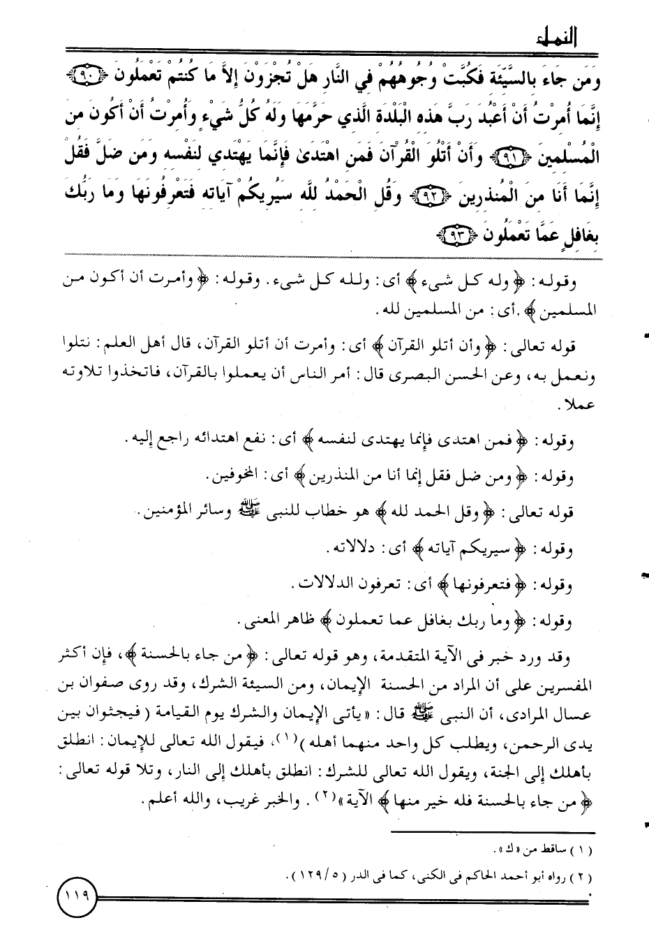 {وَمن جَاءَ بِالسَّيِّئَةِ فكبت وُجُوههم فِي النَّار هَل تُجْزونَ إِلَّا مَا كُنْتُم تَعْمَلُونَ (90) إِنَّمَا أمرت أَن أعبد رب هَذِه الْبَلدة الَّذِي حرمهَا وَله كل شَيْء وَأمرت أَن أكون من الْمُسلمين (91) وَأَن أتلو الْقُرْآن فَمن اهْتَدَى فَإِنَّمَا يَهْتَدِي لنَفسِهِ وَمن ضل فَقل إِنَّمَا أَنا من الْمُنْذرين (92) وَقل الْحَمد لله سيريكم آيَاته فتعرفونها وَمَا رَبك بغافل عَمَّا تَعْمَلُونَ (93) }
