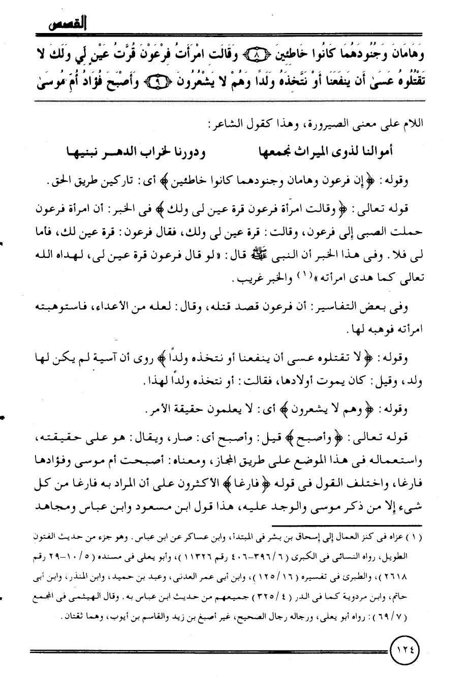 قَوْله تَعَالَى: {وَقَالَت امْرَأَة فِرْعَوْن قُرَّة عين لي وَلَك} فِي الْخَبَر: أَن امْرَأَة فِرْعَوْن حملت الصَّبِي إِلَى فِرْعَوْن، وَقَالَت: قُرَّة عين لي وَلَك، فَقَالَ فِرْعَوْن: قُرَّة عين لَك، فَأَما لي فَلَا. وَفِي هَذَا الْخَبَر أَن النَّبِي قَالَ: " لَو قَالَ فِرْعَوْن قُرَّة عين لي، لهداه الله تَعَالَى كَمَا هدى امْرَأَته " وَالْخَبَر غَرِيب.
