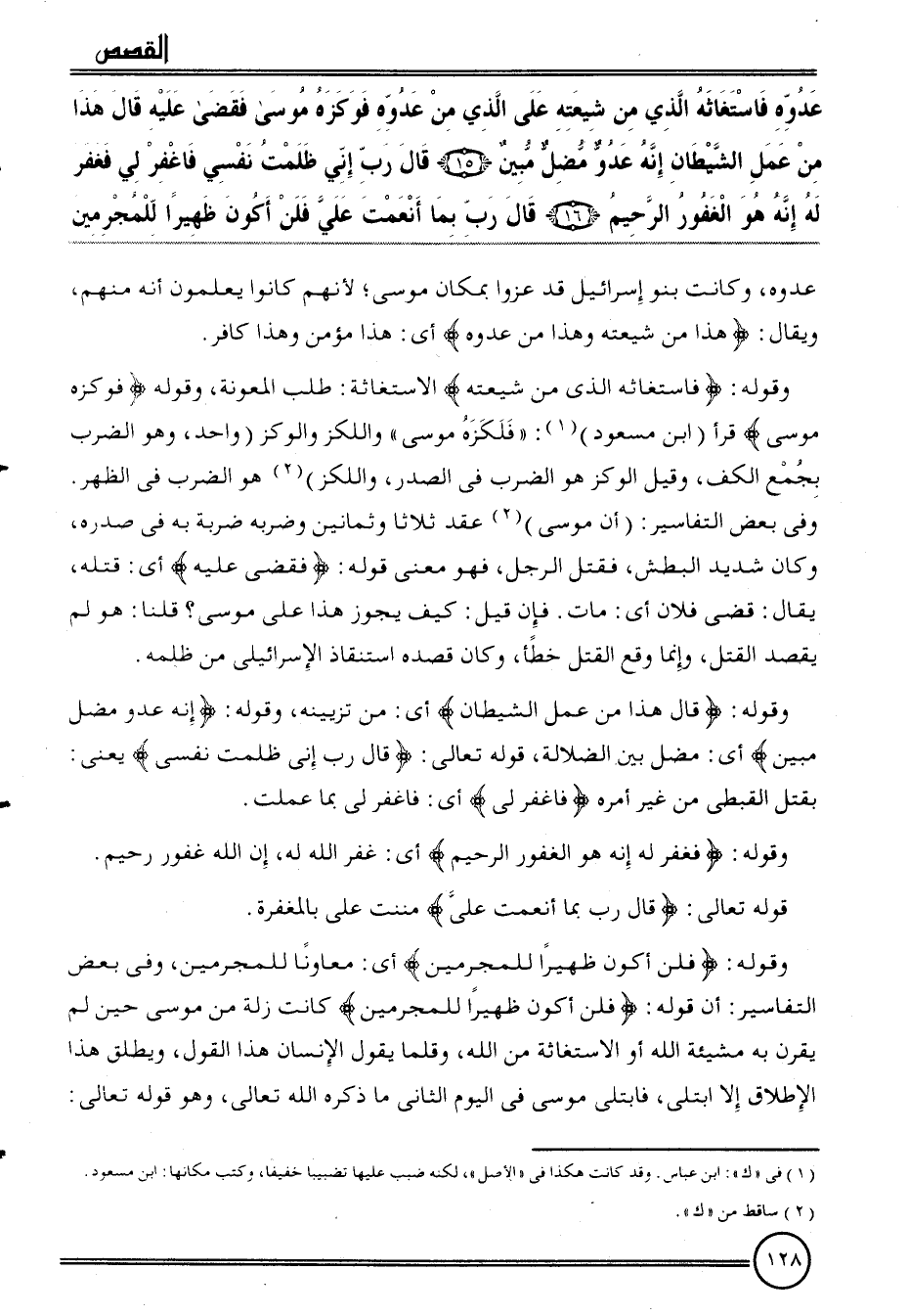 {عدوه فاستغاثه الَّذِي من شيعته على الَّذِي من عدوه فوكزه مُوسَى فَقضى عَلَيْهِ قَالَ هَذَا من عمل الشَّيْطَان إِنَّه عَدو مضل مُبين (15) قَالَ رب إِنِّي ظلمت نَفسِي فَاغْفِر لي فغفر لَهُ إِنَّه هُوَ الغفور الرَّحِيم (16) قَالَ رب بِمَا أَنْعَمت عَليّ فَلَنْ أكون ظهيرا للمجرمين} عدوه، وَكَانَت بَنو إِسْرَائِيل قد عزوا بمَكَان مُوسَى؛ لأَنهم كَانُوا يعلمُونَ أَنه مِنْهُم، وَيُقَال: {هَذَا من شيعته وَهَذَا من عدوه} أَي: هَذَا مُؤمن وَهَذَا كَافِر.