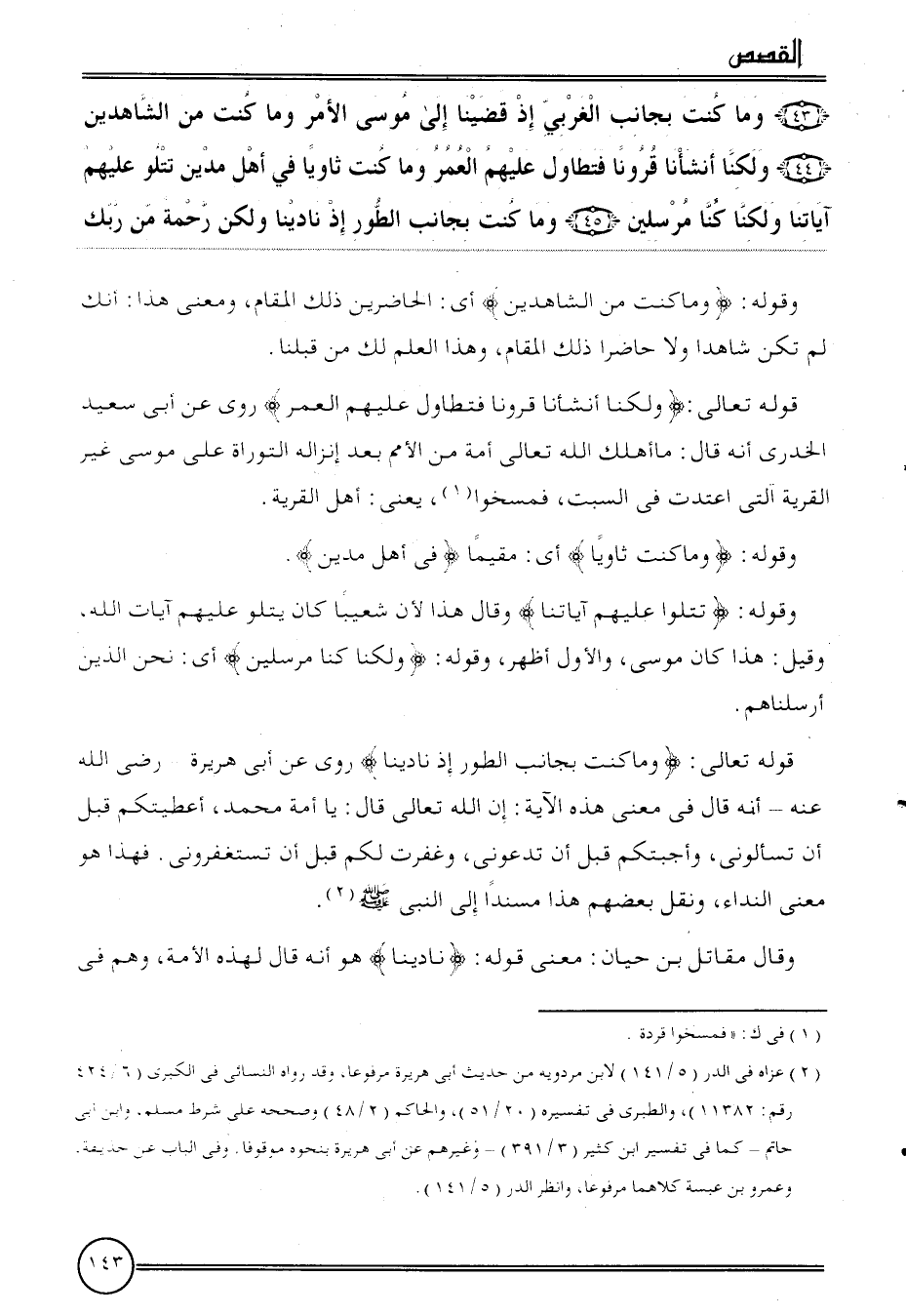 ( {43) وَمَا كنت بِجَانِب الغربي إِذْ قضينا إِلَى مُوسَى الْأَمر وَمَا كنت من الشَّاهِدين (44) وَلَكنَّا أنشأنا قرونا فتطاول عَلَيْهِم الْعُمر وَمَا كنت ثاويا فِي أهل مَدين تتلو عَلَيْهِم آيَاتنَا وَلَكنَّا كُنَّا مرسلين (45) وَمَا كنت بِجَانِب الطّور إِذْ نادينا وَلَكِن رَحْمَة من رَبك}