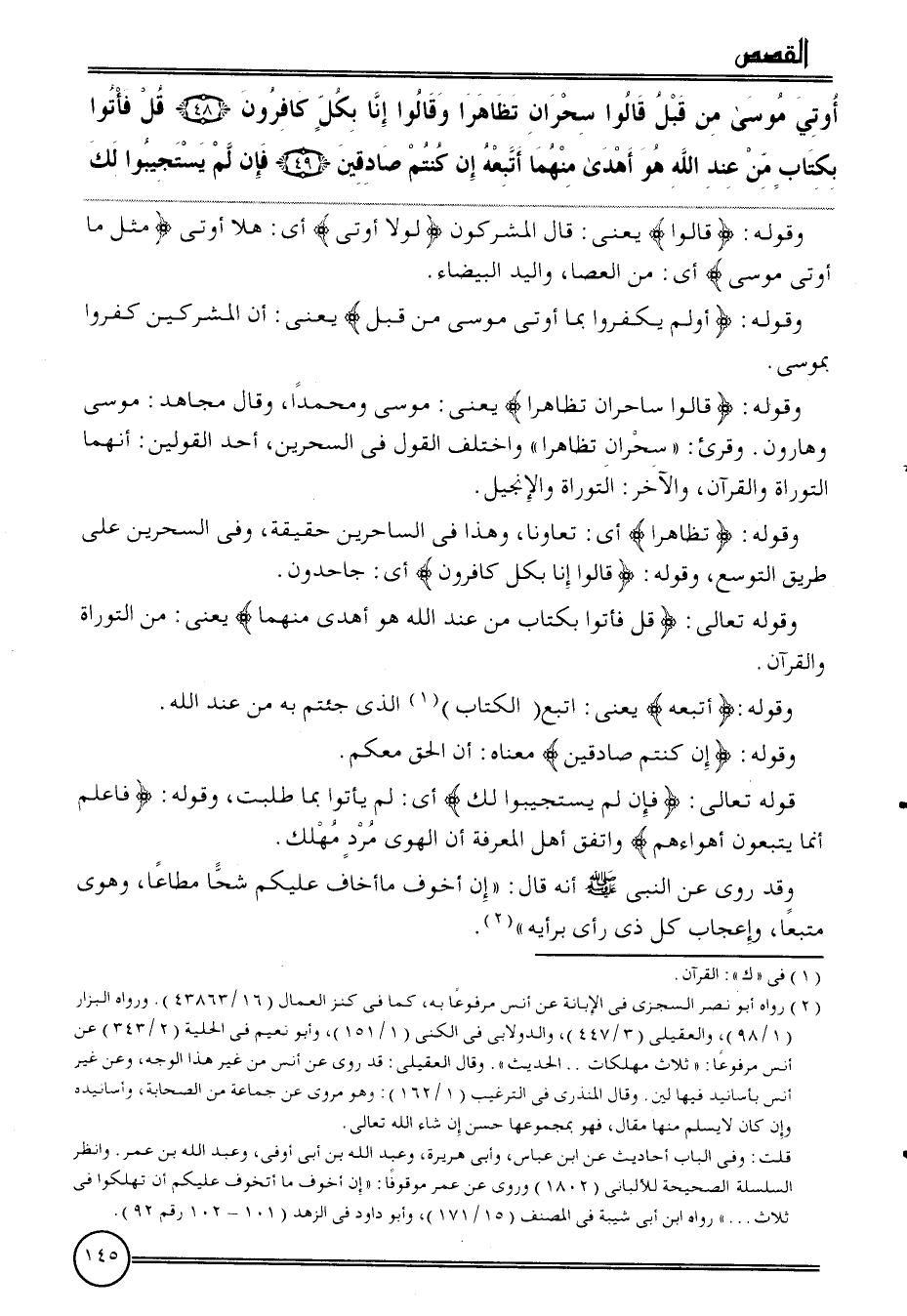 {أُوتِيَ مُوسَى من قبل قَالُوا سحران تظاهرا وَقَالُوا إِنَّا بِكُل كافرون (48) قل فَأتوا بِكِتَاب من عِنْد الله هُوَ أهْدى مِنْهُمَا أتبعه إِن كُنْتُم صَادِقين (49) فَإِن لم يَسْتَجِيبُوا لَك}